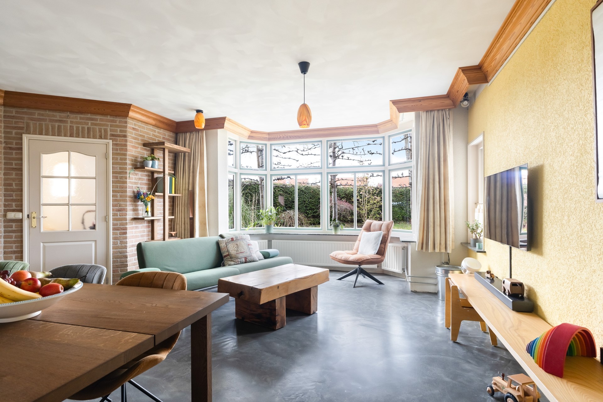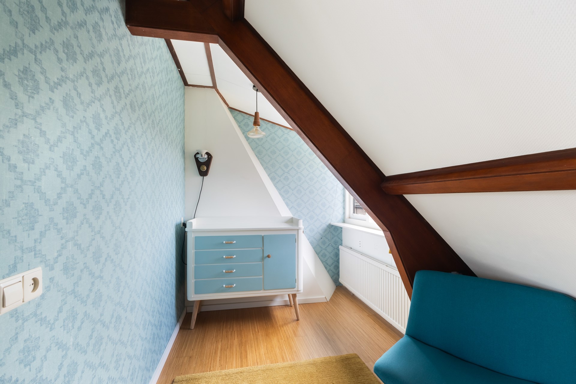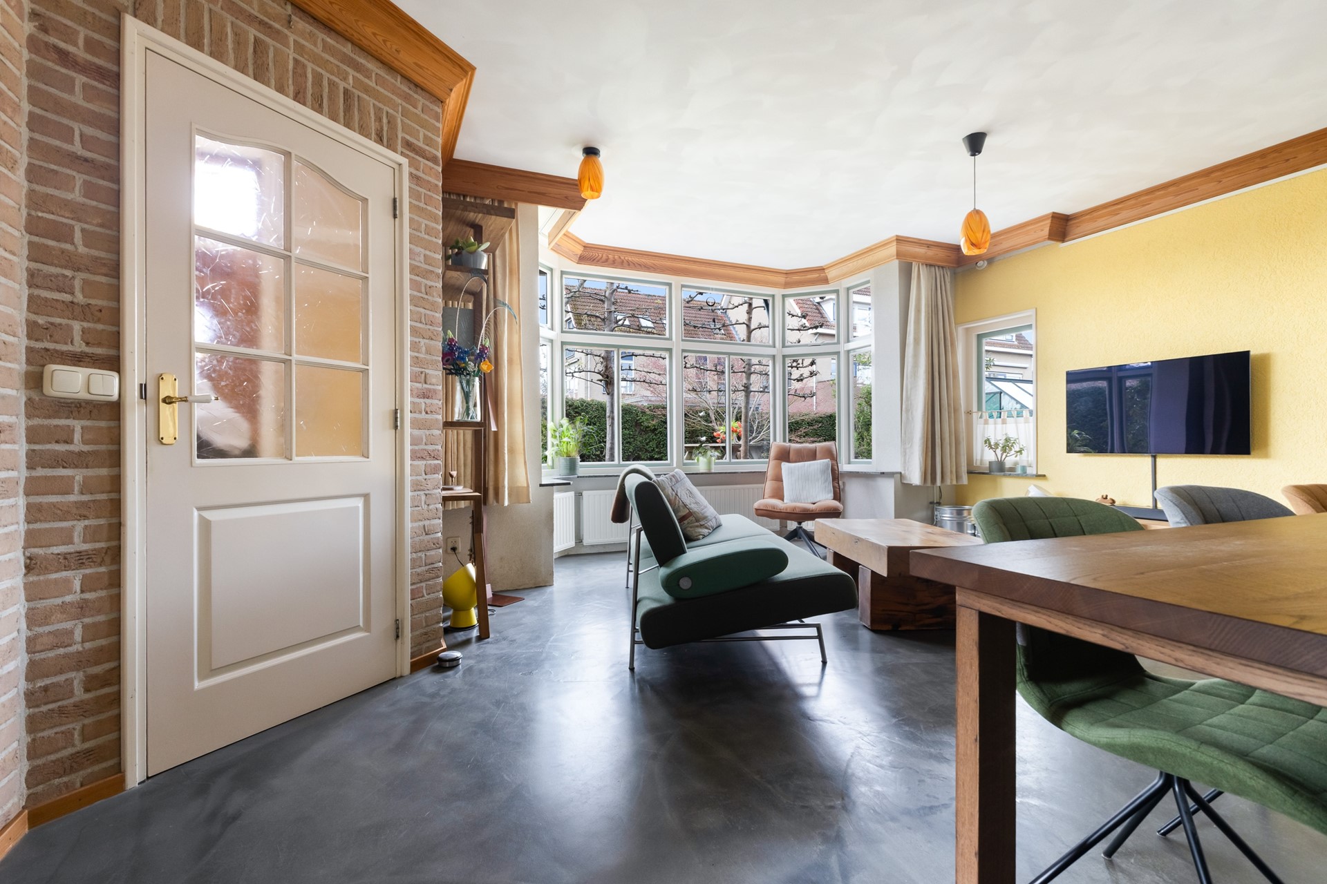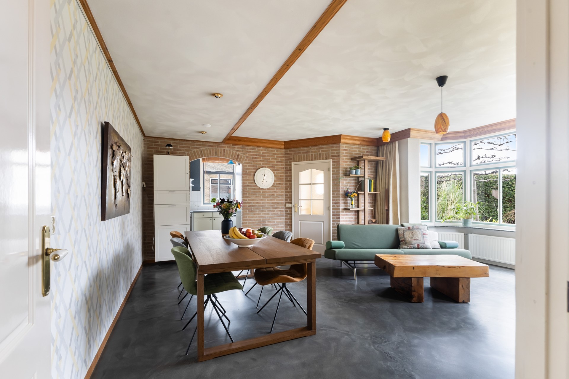 Je komt binnen in de hal met trapopgang en meterkast. Vanuit hier loop je door naar de woonkamer en daar zie je meteen wat deze woning anders maakt. Geen standaard rechthoekige ruimte, maar een speels geheel met veel lichtinval, onder andere door de erker. Het voelt hier gewoon prettig.