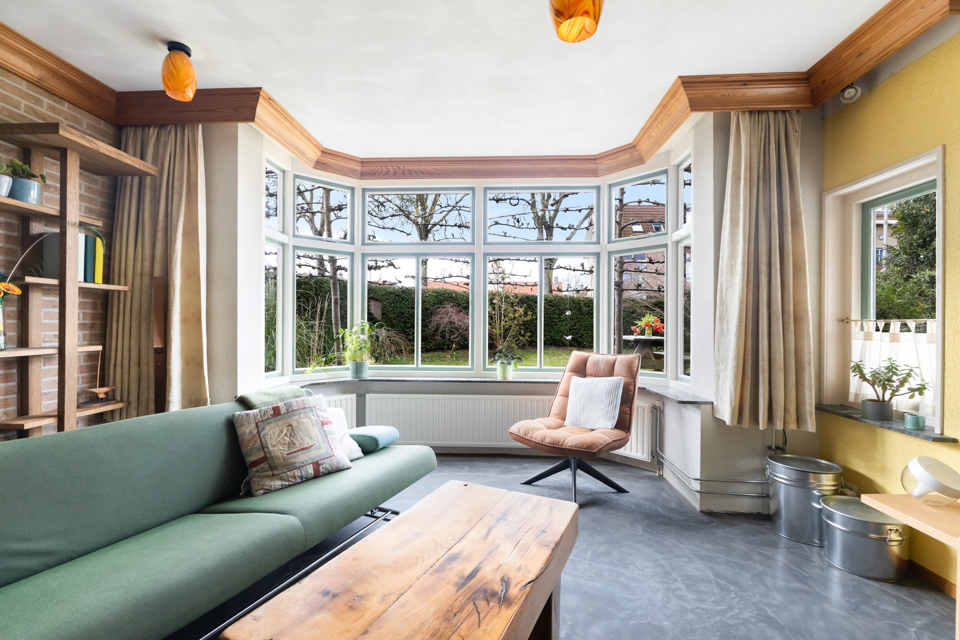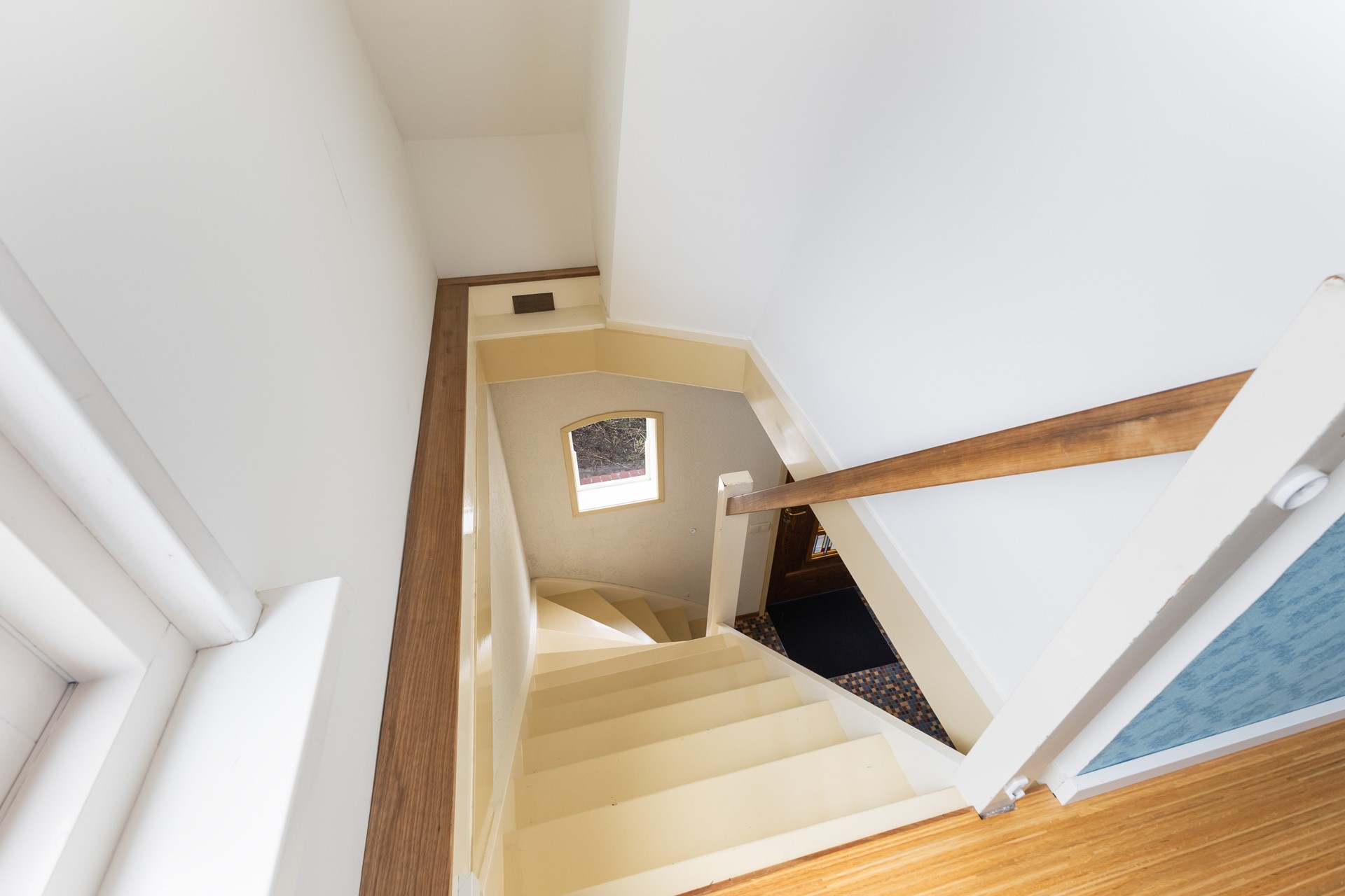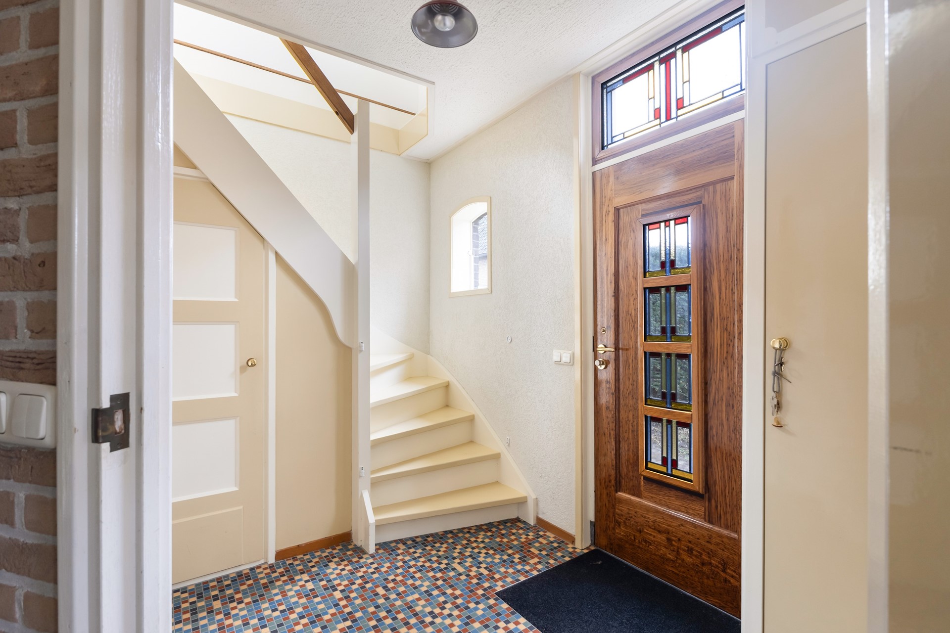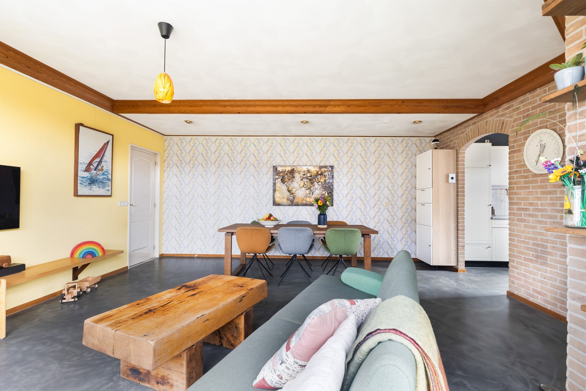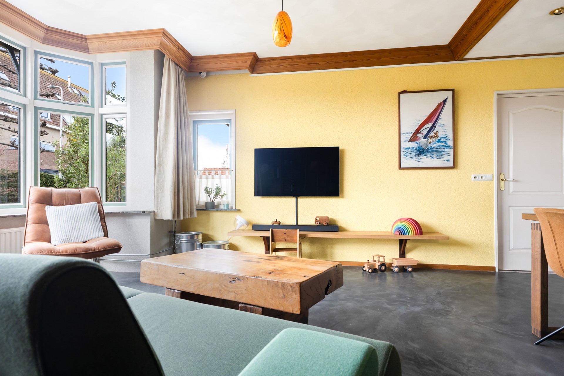 Je komt binnen in de hal met trapopgang en meterkast. Vanuit hier loop je door naar de woonkamer en daar zie je meteen wat deze woning anders maakt. Geen standaard rechthoekige ruimte, maar een speels geheel met veel lichtinval, onder andere door de erker. Het voelt hier gewoon prettig.