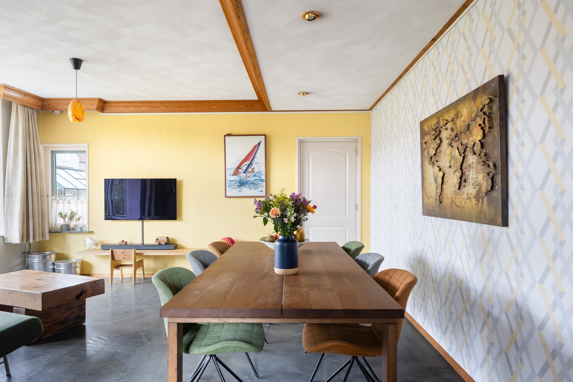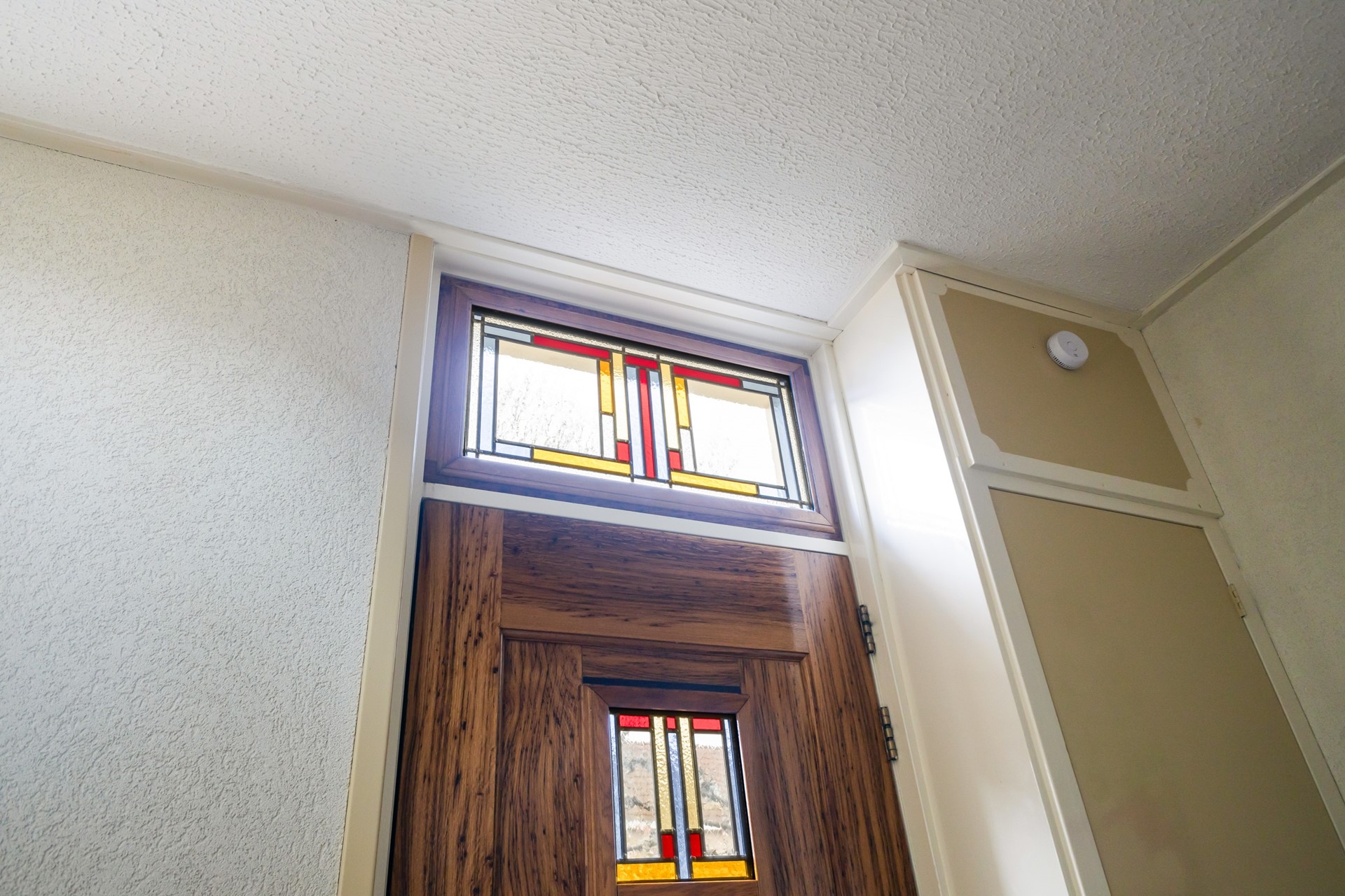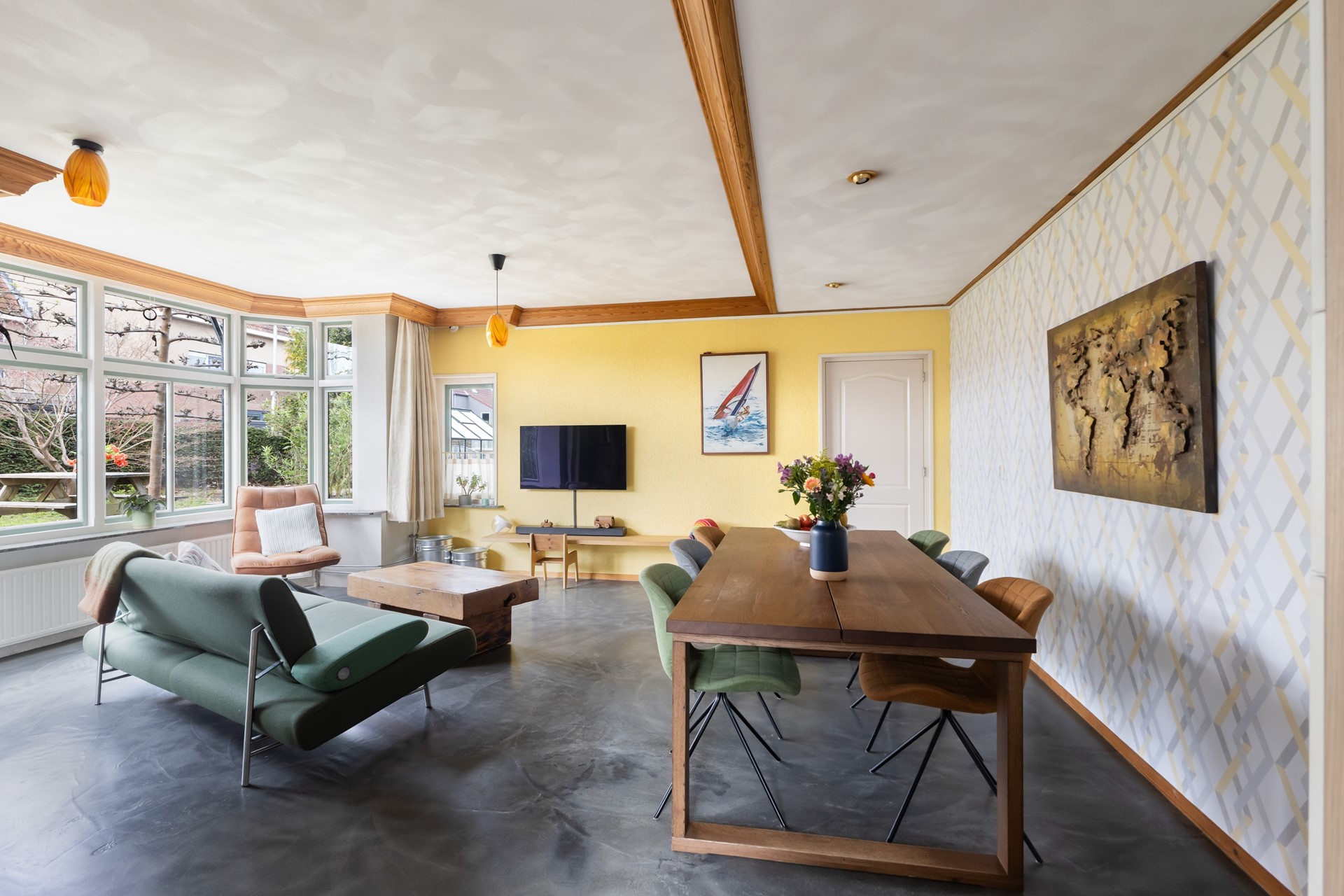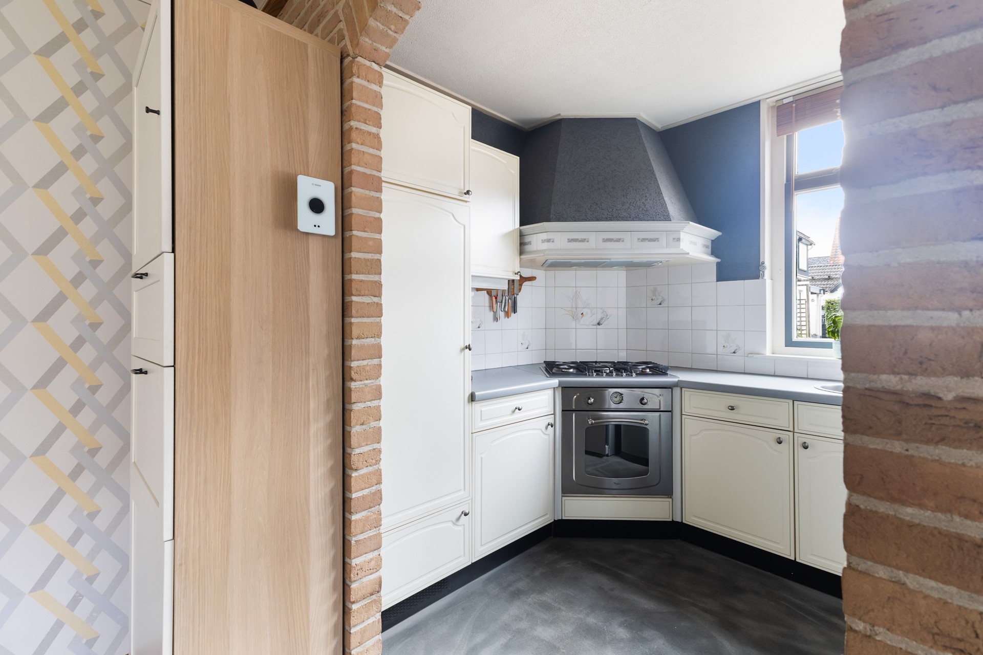 Je komt binnen in de hal met trapopgang en meterkast. Vanuit hier loop je door naar de woonkamer en daar zie je meteen wat deze woning anders maakt. Geen standaard rechthoekige ruimte, maar een speels geheel met veel lichtinval, onder andere door de erker. Het voelt hier gewoon prettig.