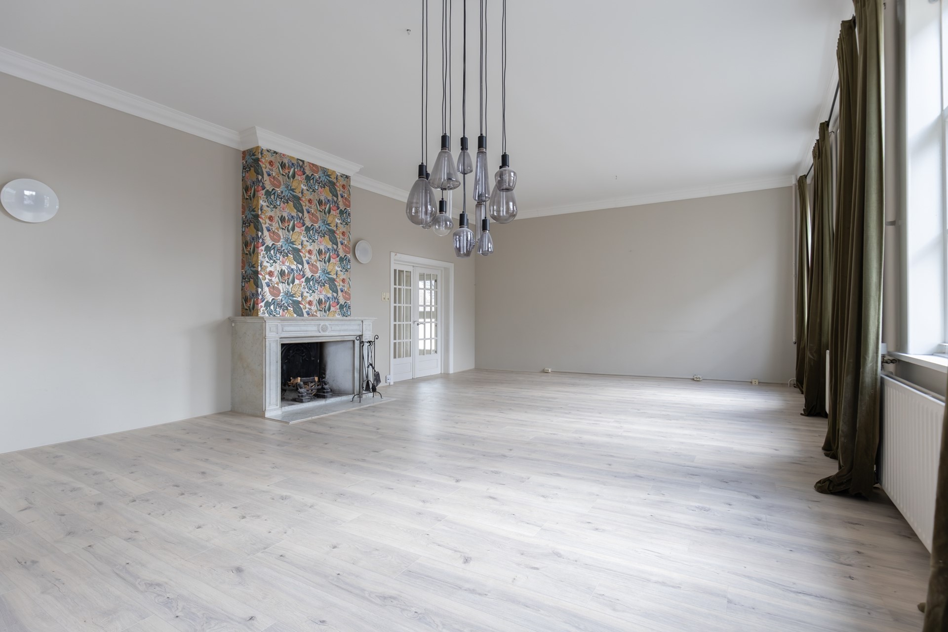 Aan de voorzijde ligt de indrukwekkende voormalige raadzaal, nu een royale woonkamer met hoge plafonds, veel licht en grote ramen. De volledige vloer is recent verwijderd en uitgevoerd met een vernieuwde, geïsoleerde en brandvertragende constructie. De woonlaag is hiermee direct klaar voor een nieuwe houten vloer of andere passende afwerking naar wens.