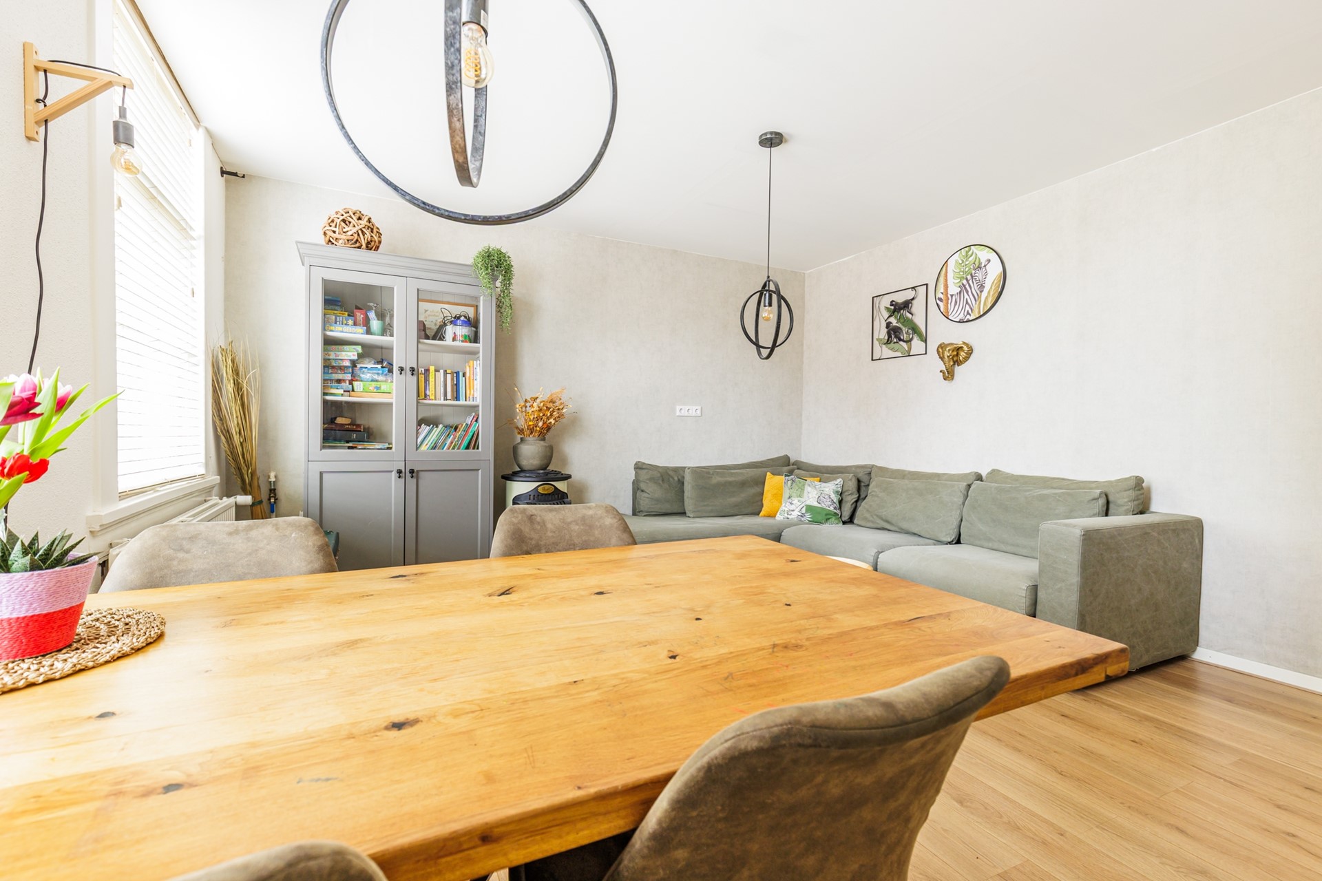 De woonkamer is royaal en prettig licht dankzij de grote raampartijen. De wanden zijn strak gestuct en de vloer is afgewerkt met laminaat, wat zorgt voor een verzorgde en moderne uitstraling binnen het karaktervolle pand. Hier is volop ruimte voor een comfortabele zithoek én een eettafel.