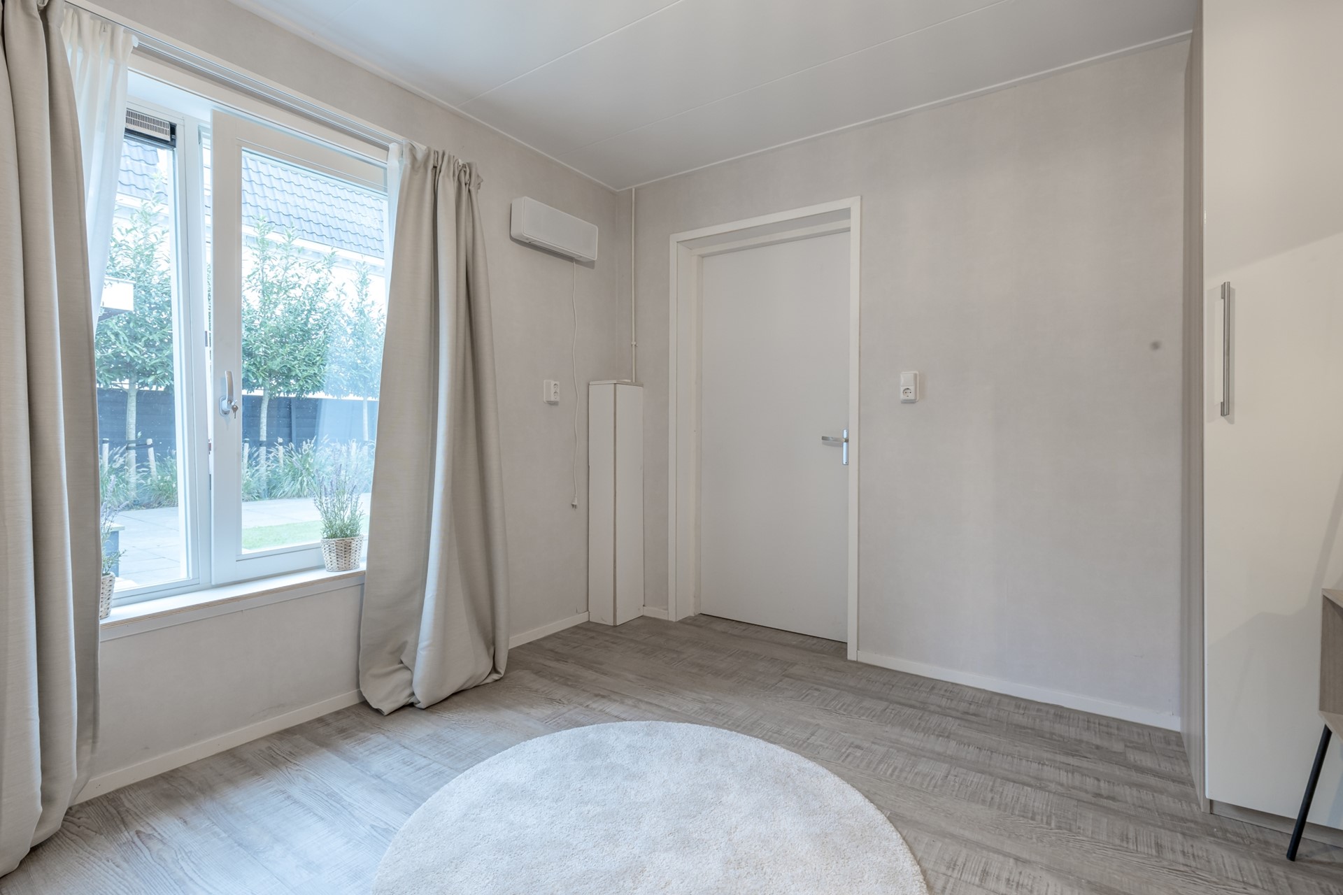 De achtertuin van ca. 55 m² is een fijne, beschutte buitenruimte. Dankzij de overkapping zit je hier al vroeg in het voorjaar en tot laat in het najaar comfortabel buiten. De achterom zorgt voor extra gemak.