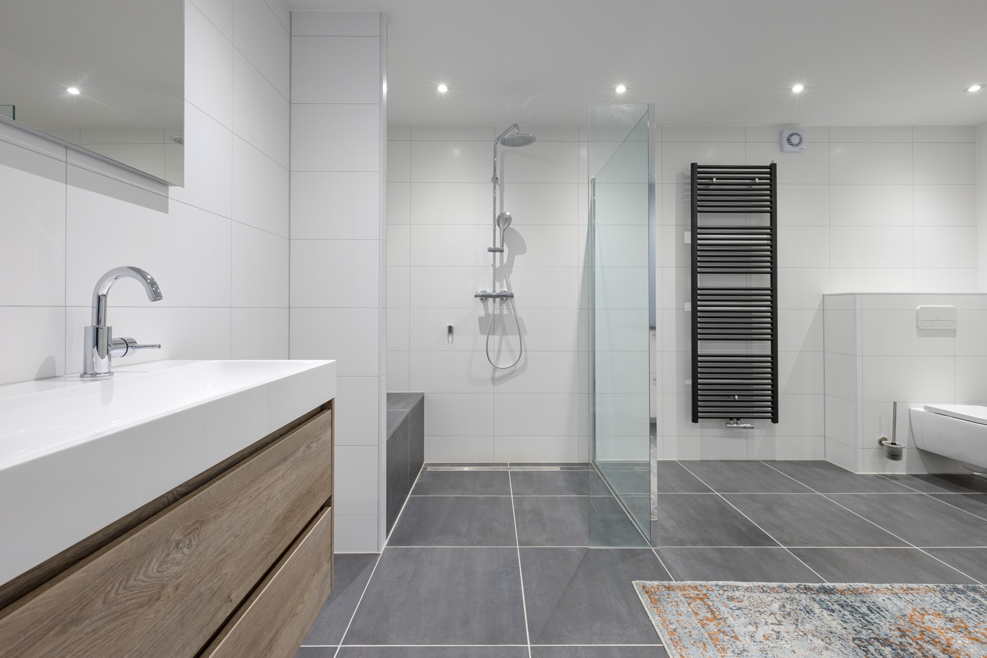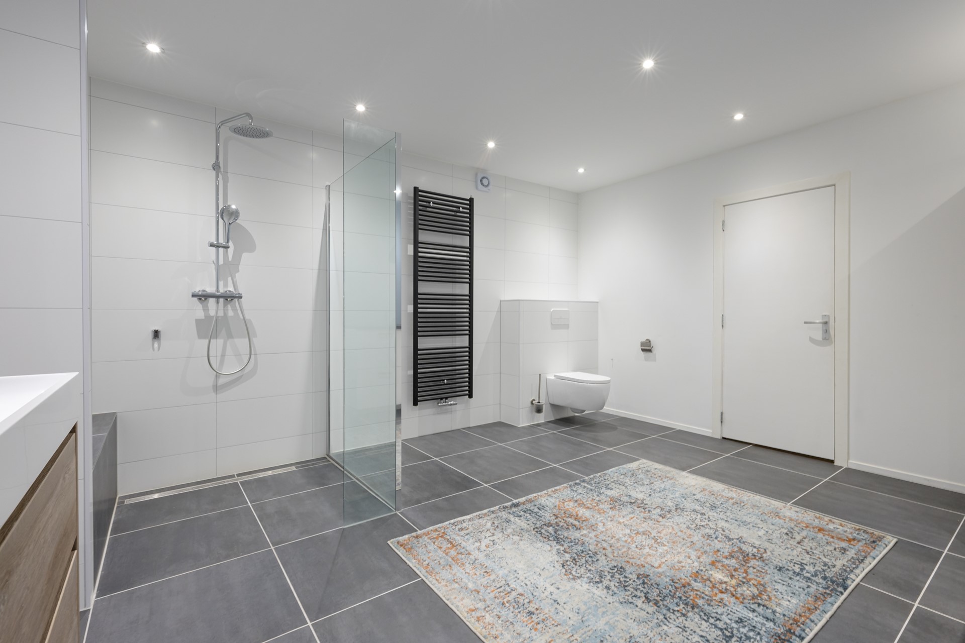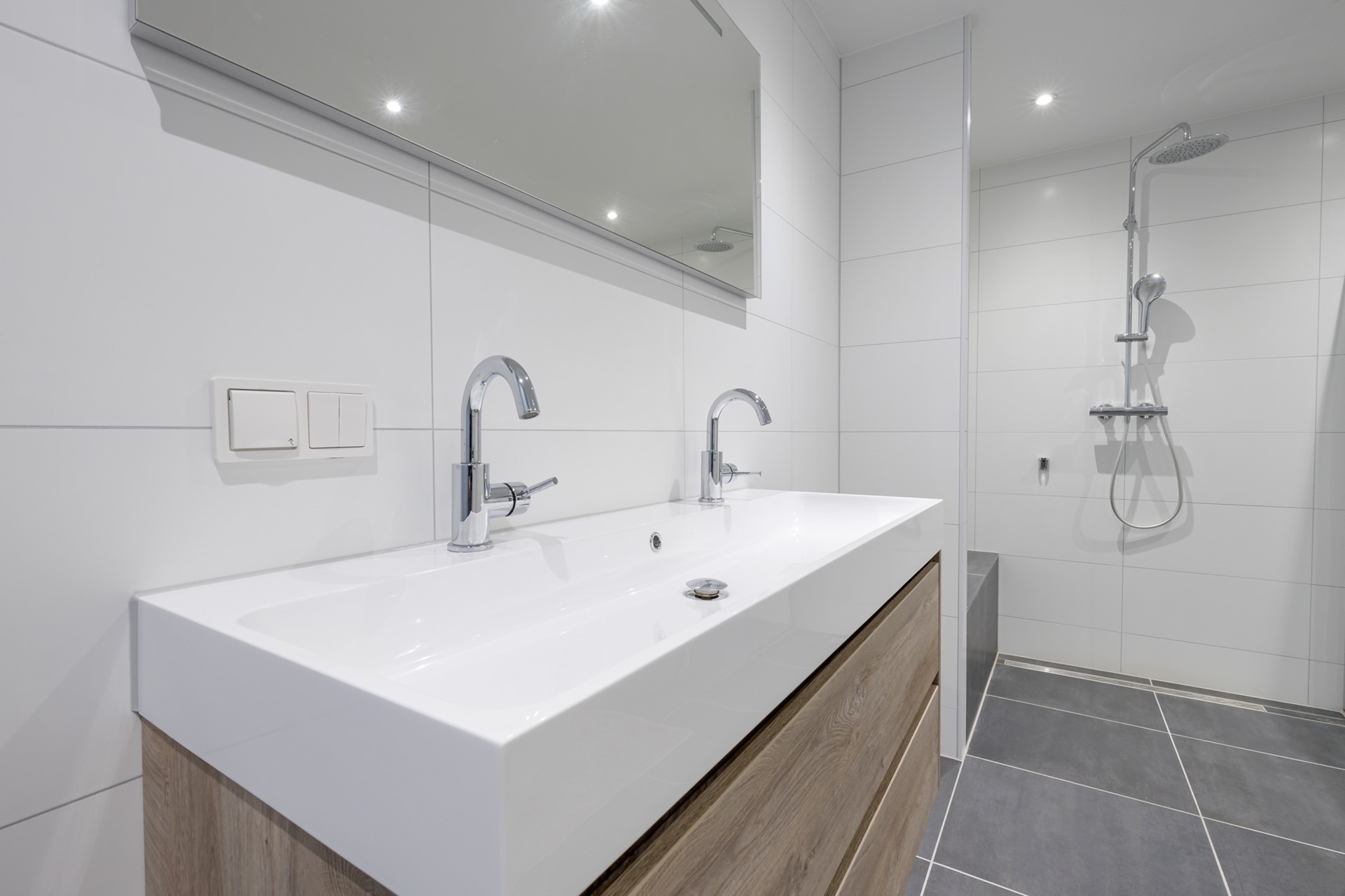 De badkamer is opvallend groot en biedt ruimte voor douche, wastafel en toilet. Een comfortabele ruimte met mogelijkheden om naar eigen wens te moderniseren of verder af te werken.