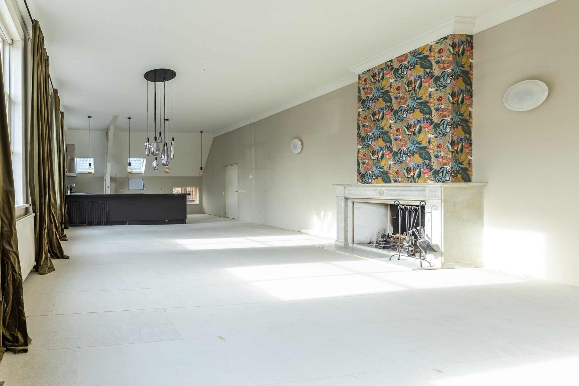 Aan de voorzijde ligt de indrukwekkende voormalige raadzaal, nu een royale woonkamer met hoge plafonds, veel licht en grote ramen. De volledige vloer is recent verwijderd en uitgevoerd met een vernieuwde, geïsoleerde en brandvertragende constructie. De woonlaag is hiermee direct klaar voor een nieuwe houten vloer of andere passende afwerking naar wens.