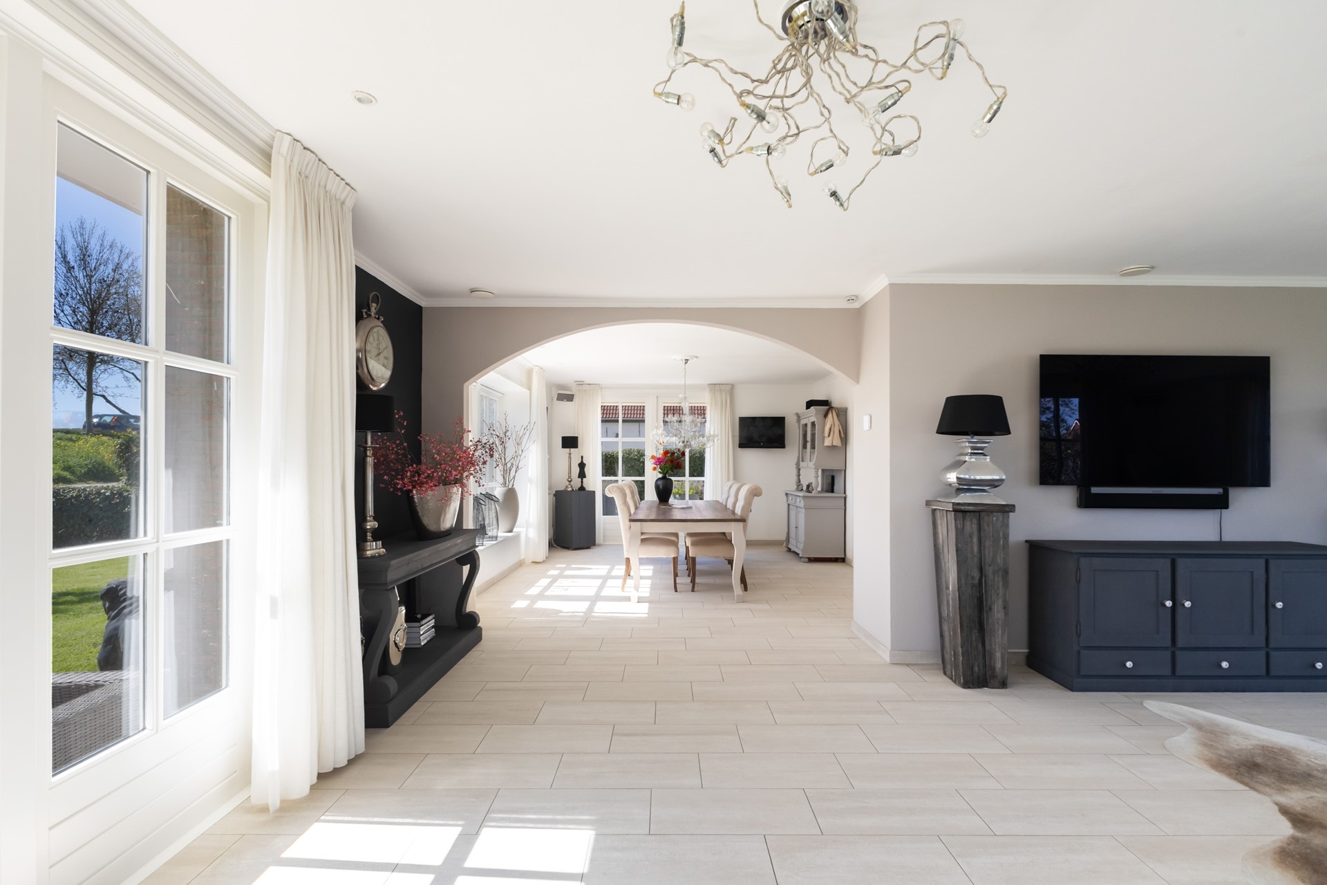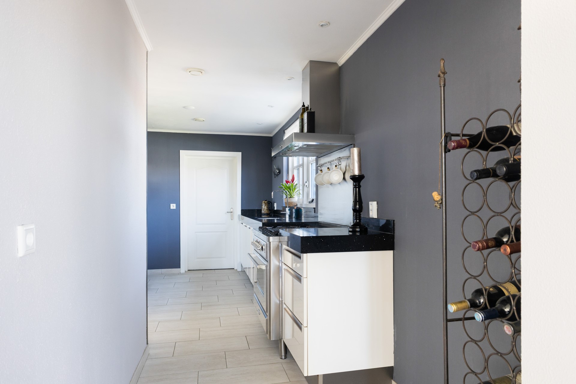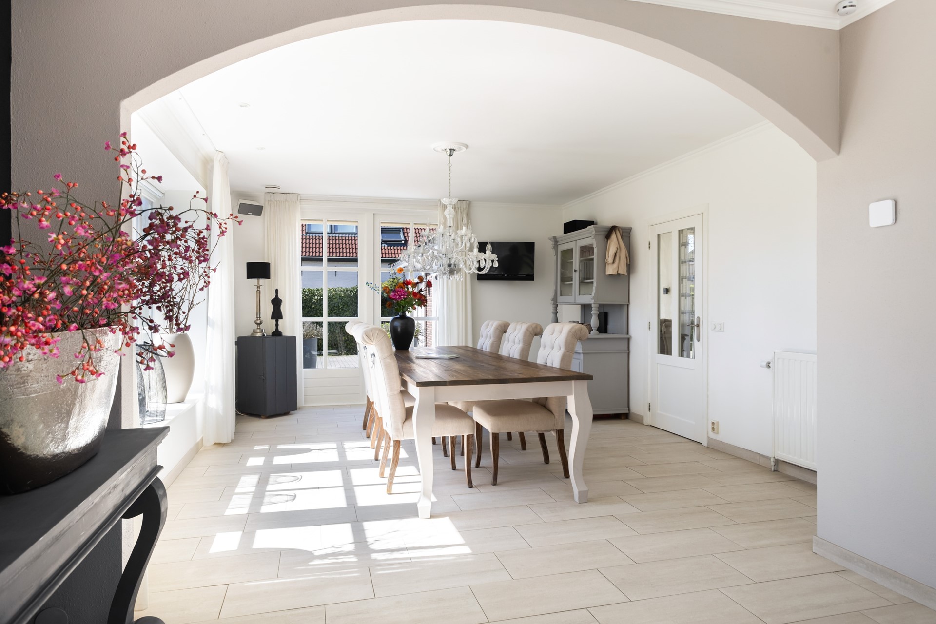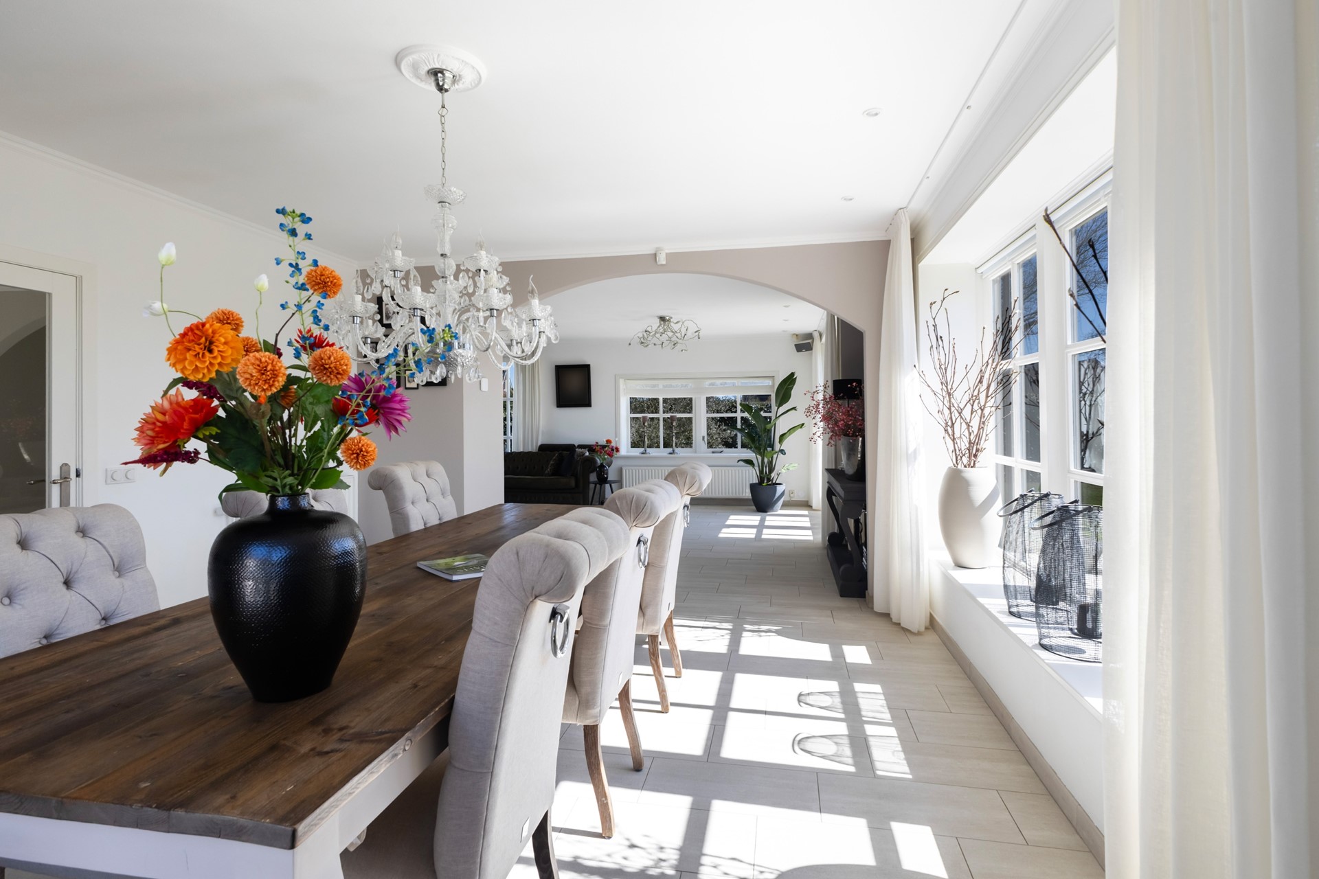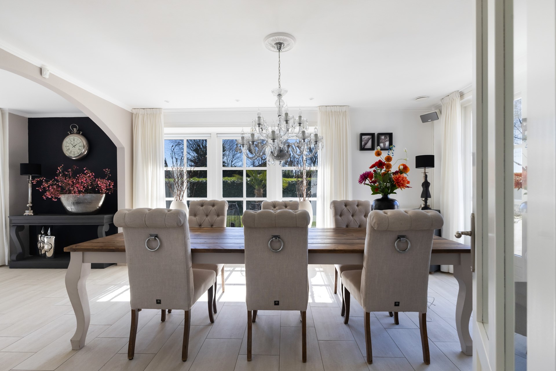 Aansluitend bevindt zich een aparte eetkamer, ideaal voor lange avonden tafelen met familie of vrienden. De halfopen keuken is luxe uitgevoerd en voorzien van onder andere een Borretti‑gasfornuis met grillplaat, dubbele koelkast/vriezer met ijsblokjesmachine, vaatwasser, combimagnetron en een inbouwkoffiezetapparaat. De keuken beschikt daarnaast over een ruime kelderkast, ideaal voor extra voorraad of opbergruimte. Vanuit de keuken is de bijkeuken bereikbaar, met extra bergzolder, aansluitingen voor wasapparatuur en de cv‑installatie.