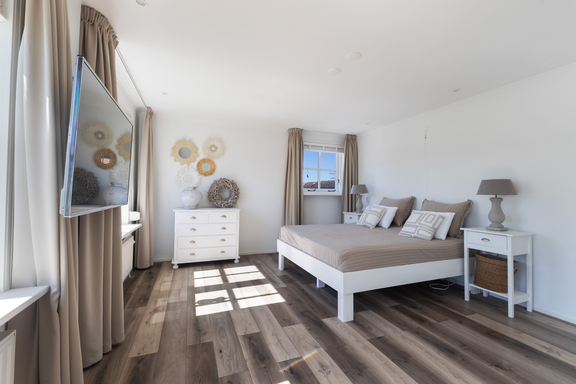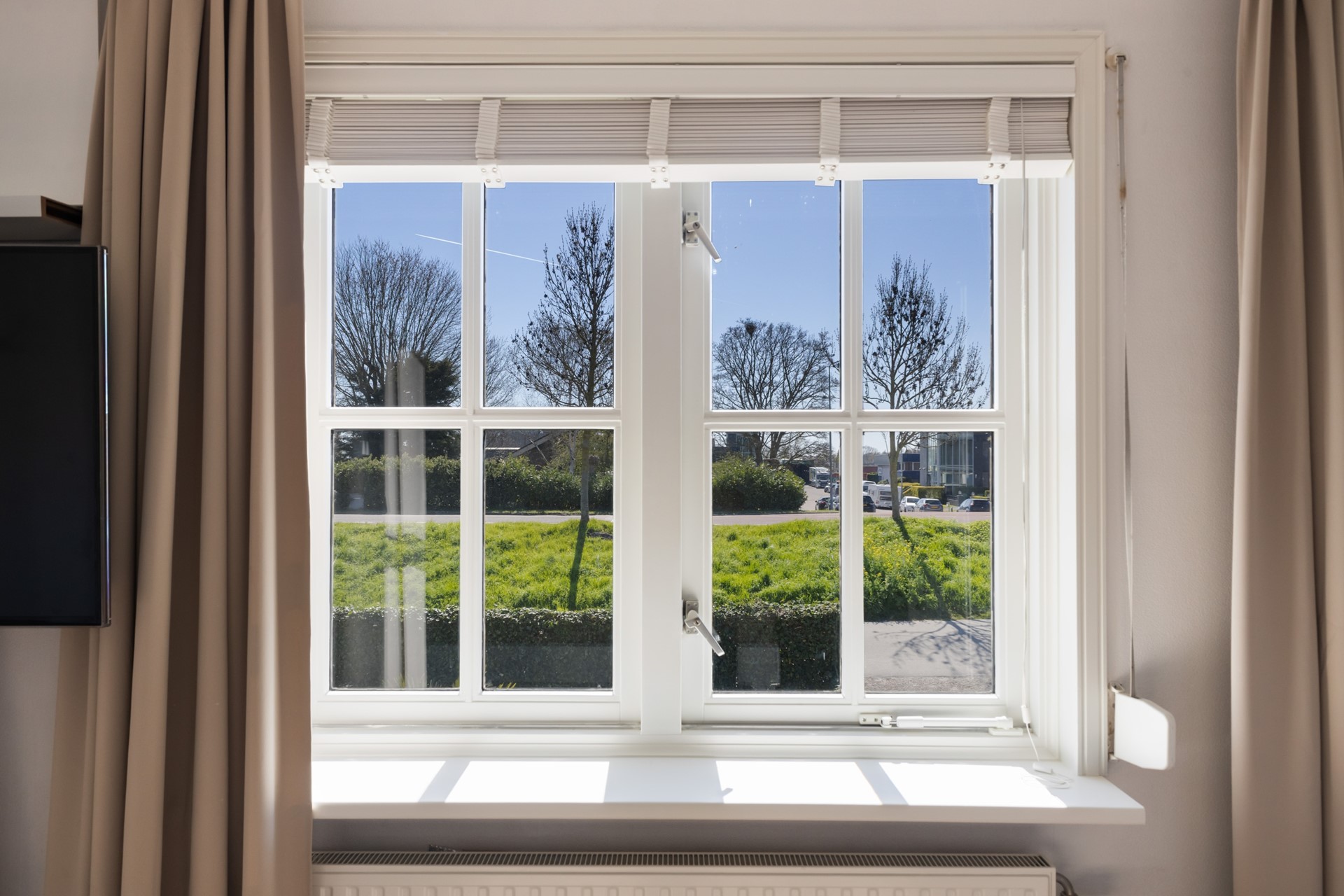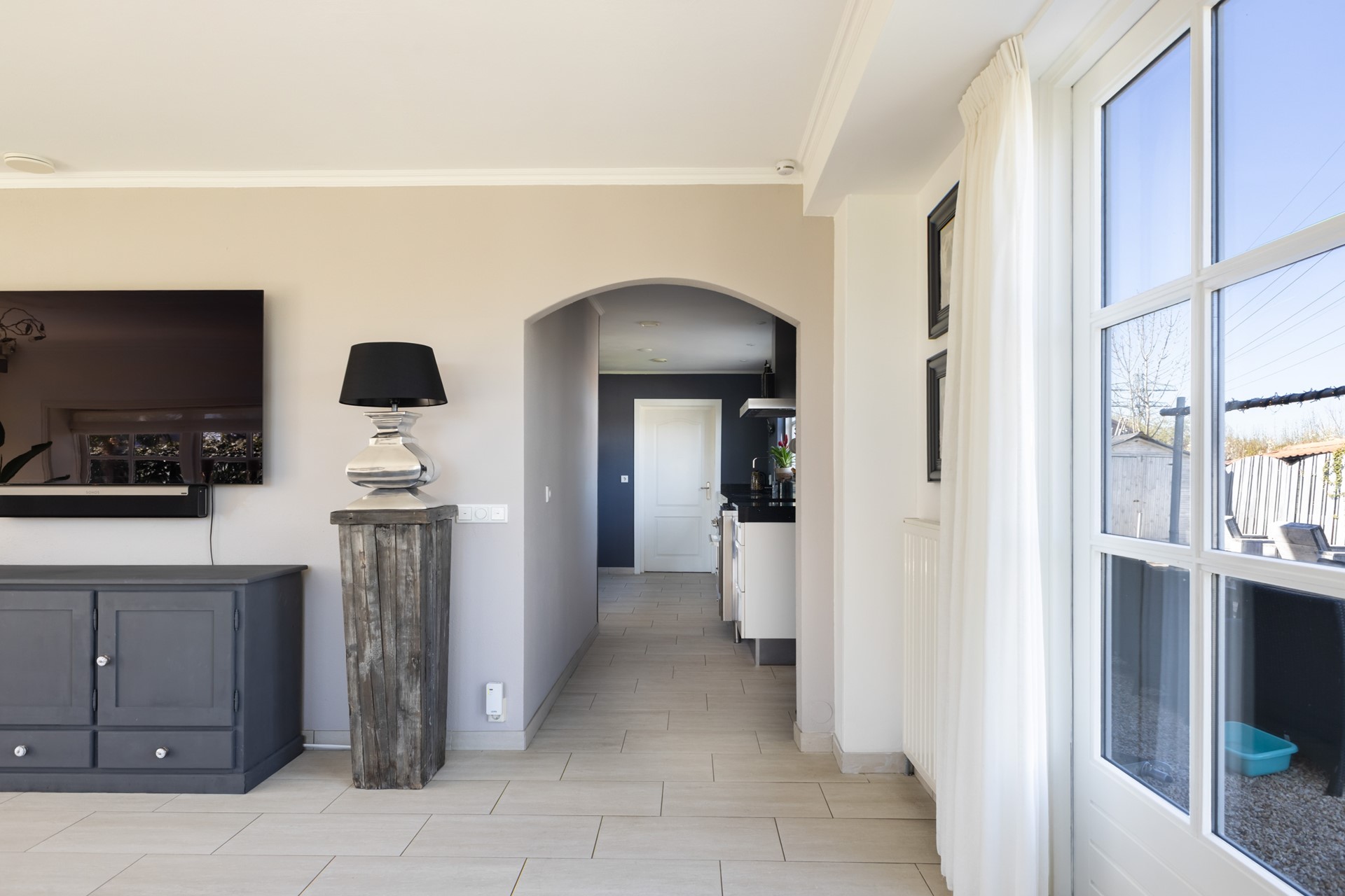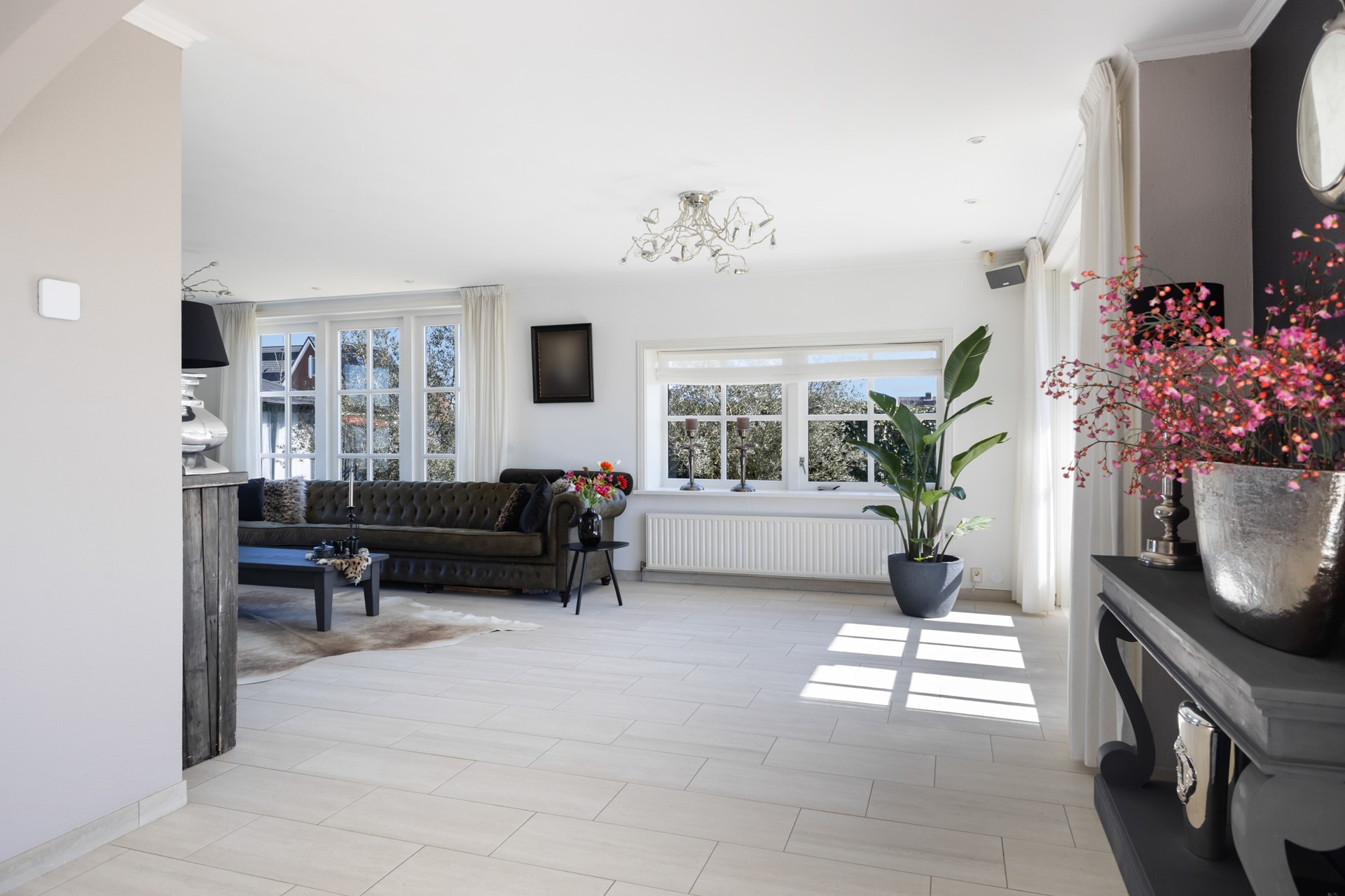 De entree geeft toegang tot een ruime hal met garderobe en toilet. De royale woonkamer van circa 60 m² is licht en ruim dankzij de grote raampartijen en openslaande deuren naar de tuin. De strak gestuukte wanden en plafonds, gecombineerd met de plavuizenvloer met vloerverwarming, zorgen voor een comfortabele en verzorgde uitstraling. Op de begane grond zijn screens aanwezig op een deel van de kozijnen, wat bijdraagt aan extra zonwering en wooncomfort.