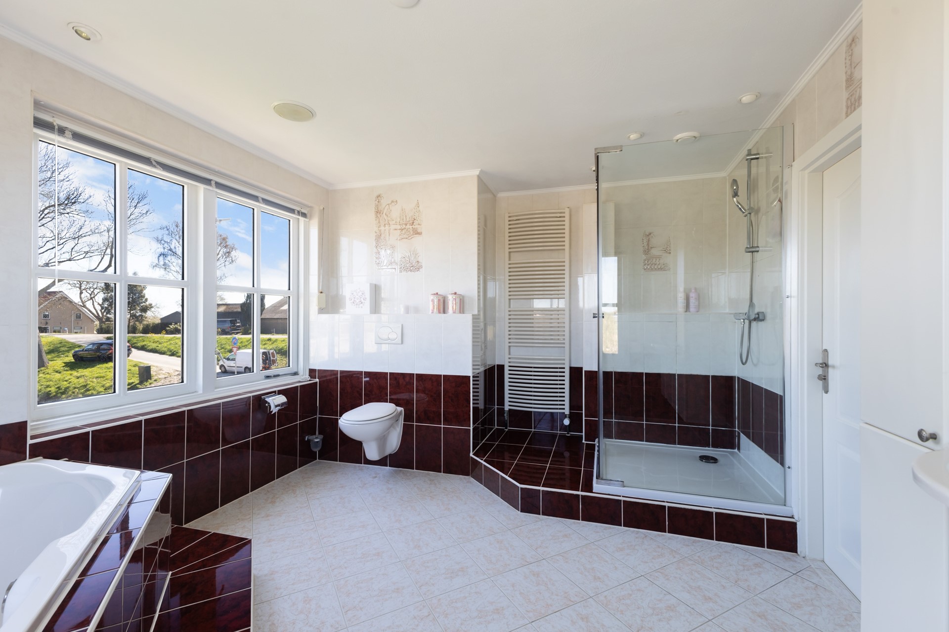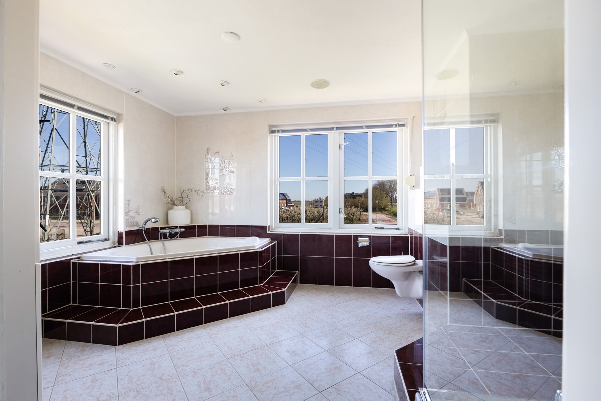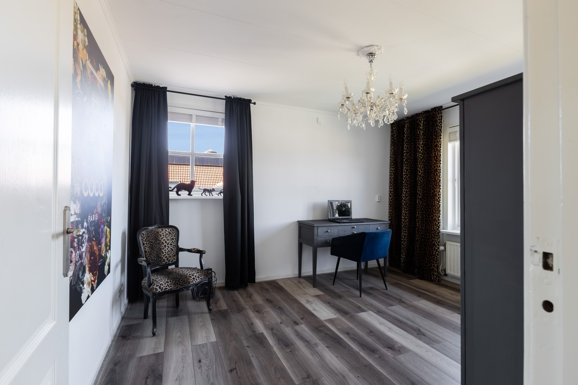 Op de eerste verdieping bevinden zich twee ruime slaapkamers aan de voorzijde van de woning, waarvan één met balkon. De derde slaapkamer ligt aan de achterzijde. Alle kamers zijn afgewerkt met strak stucwerk en doorgelegde laminaatvloeren. De badkamer is royaal en compleet ingericht met een hoekligbad, een aparte douche, een wastafel met meubel, een tweede toilet en een designradiator.
