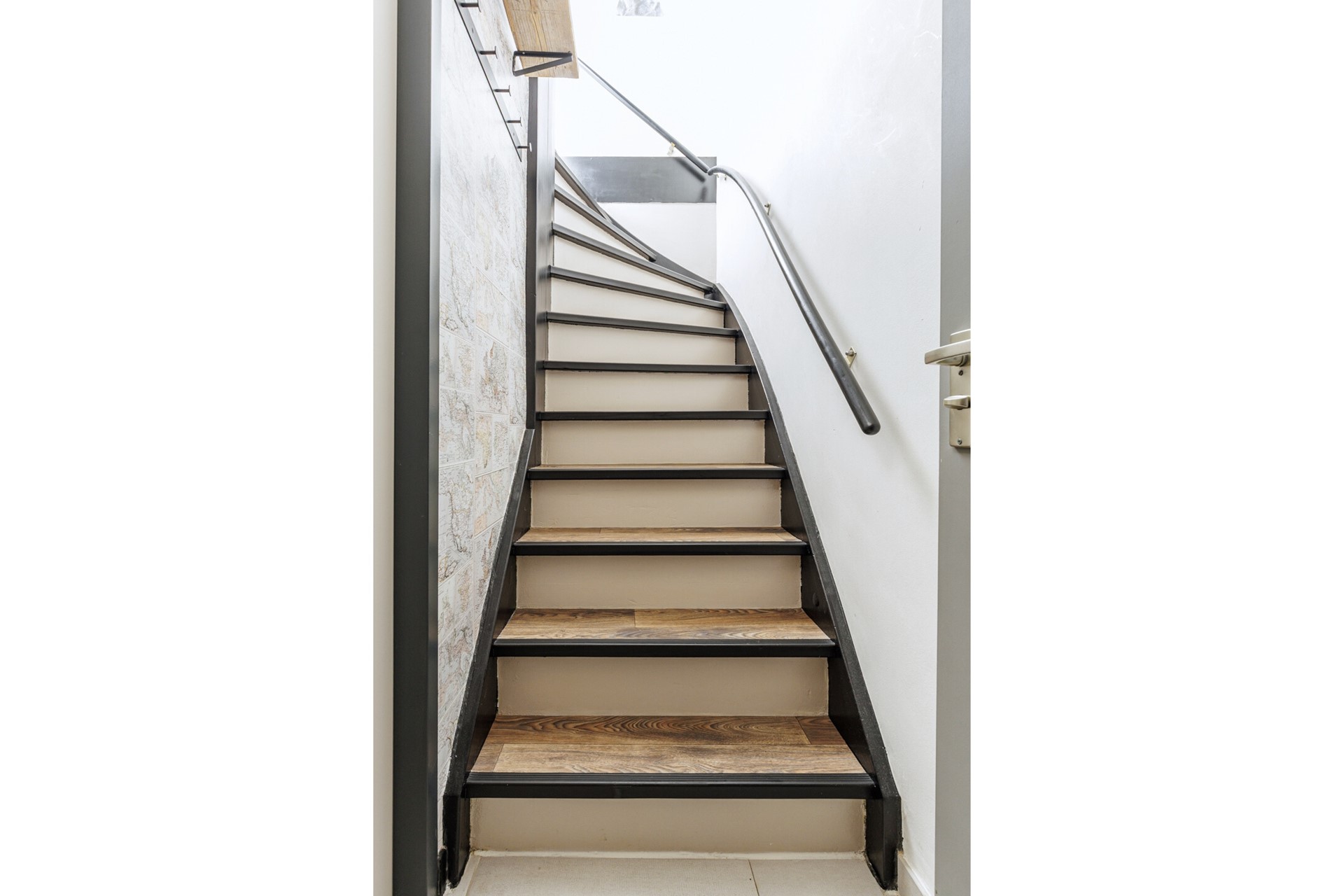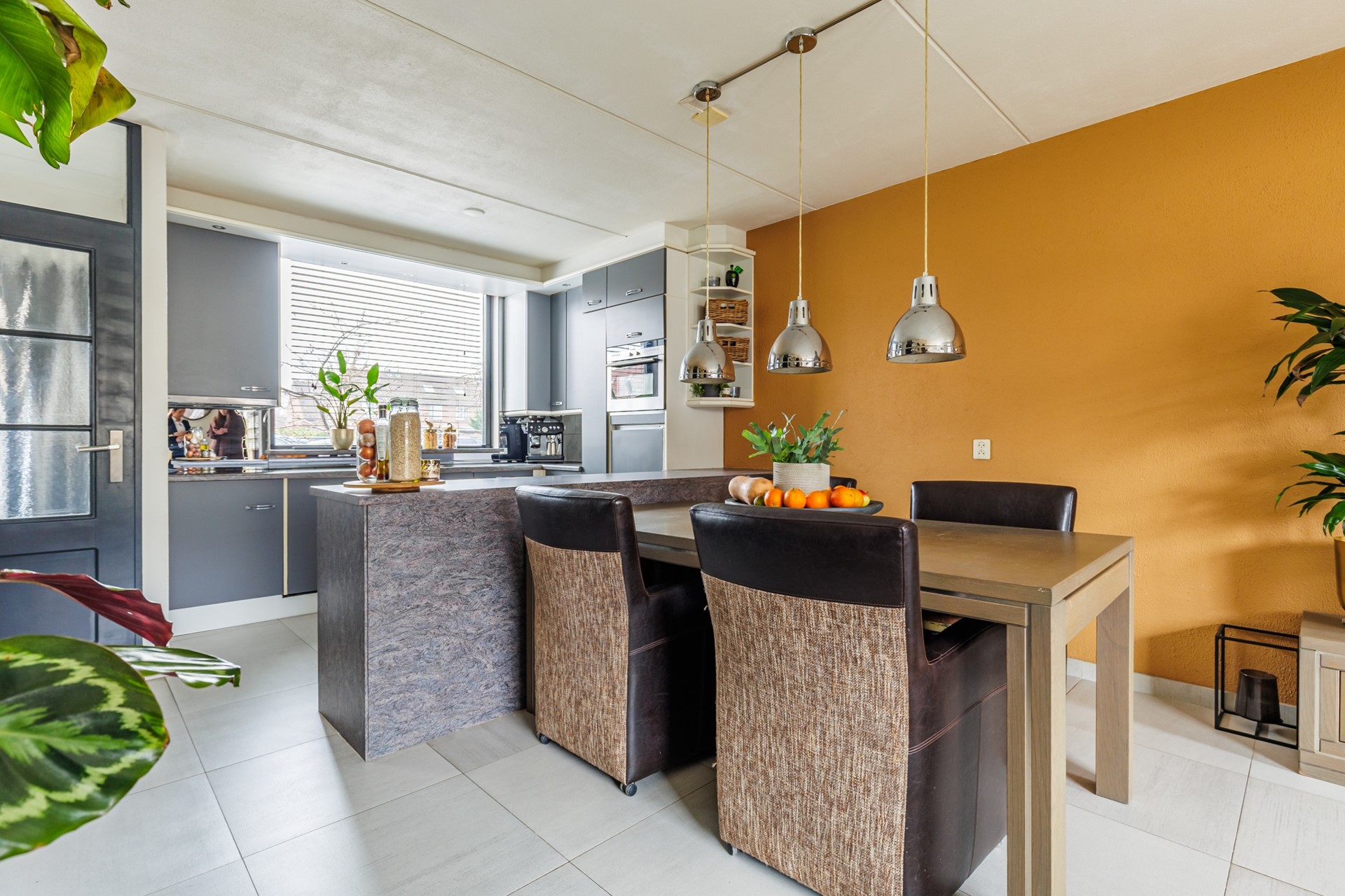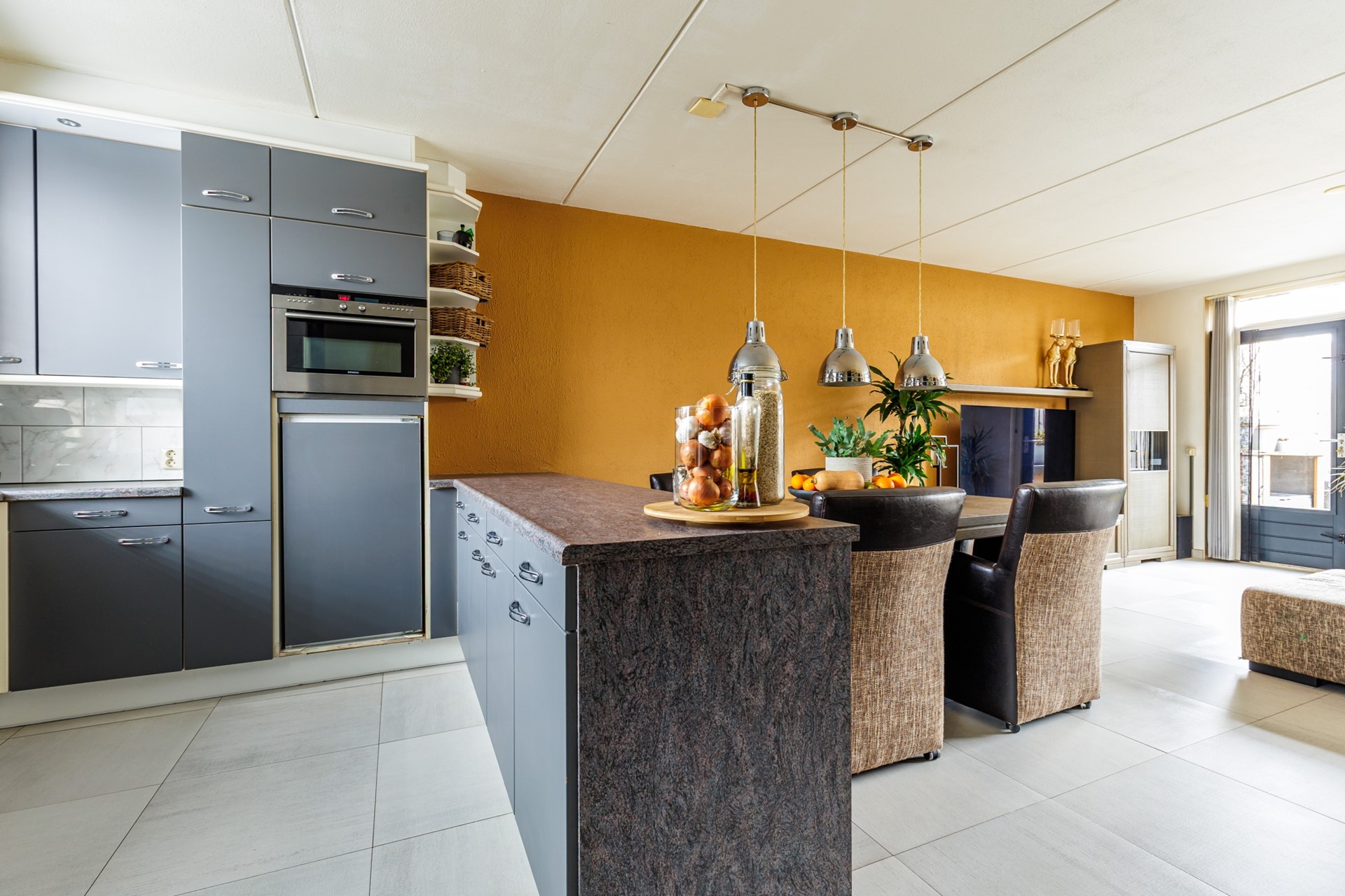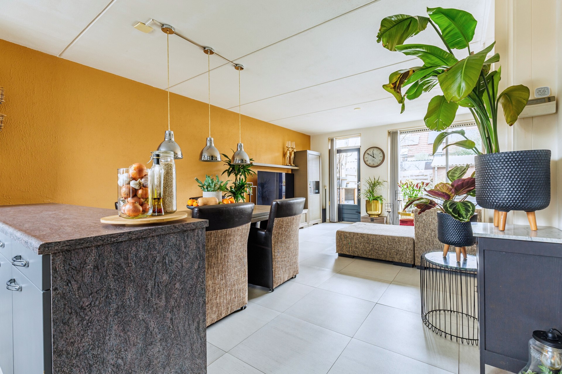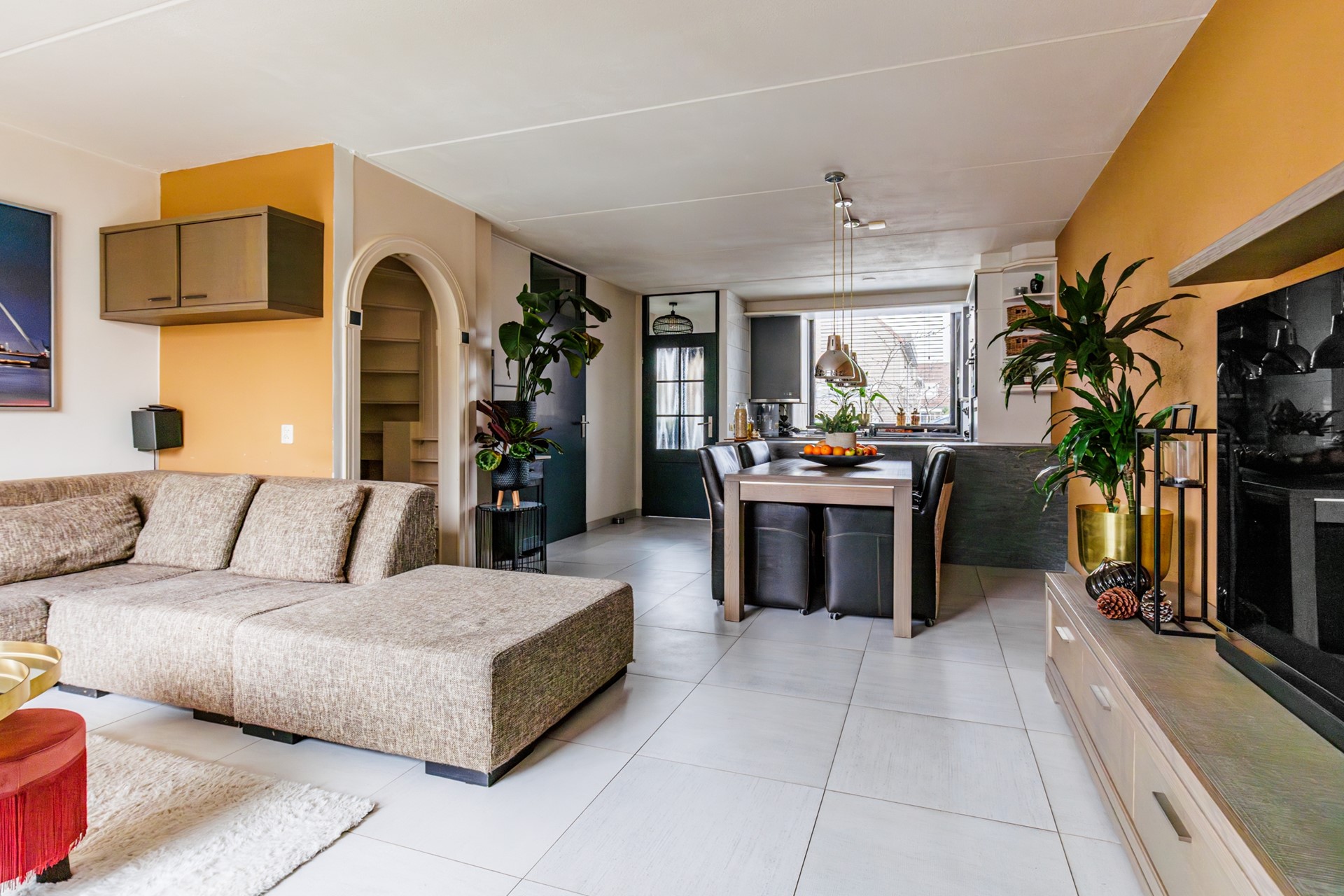 Via de entree kom je in de hal met meterkast en toegang tot de woonkamer. De begane grond is afgewerkt met een plavuizenvloer en voorzien van comfortabele vloerverwarming – praktisch én prettig in gebruik. De woonkamer is licht en ruim opgezet en beschikt over een schuifpui naar de achtertuin, wat zorgt voor een fijne verbinding tussen binnen en buiten.