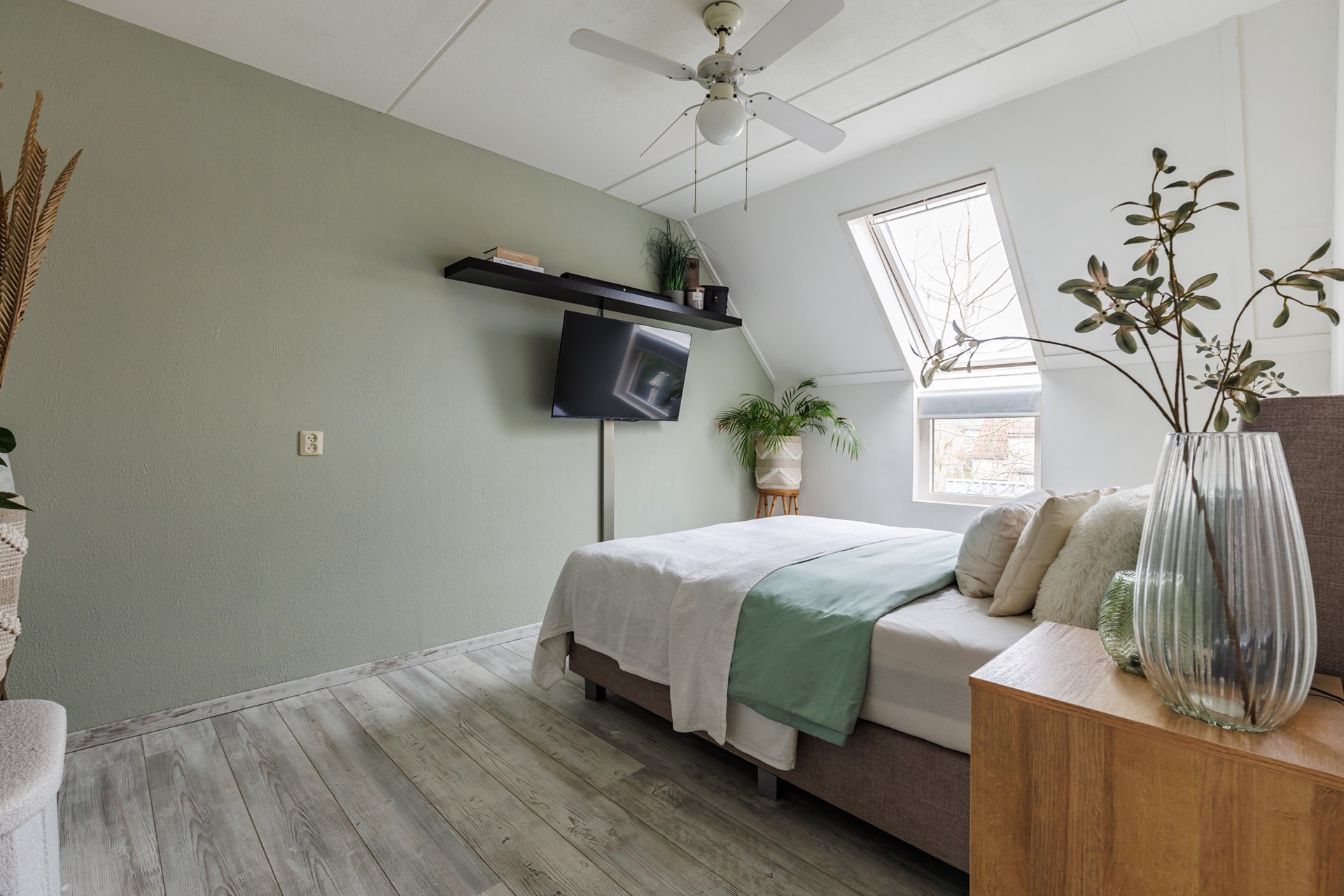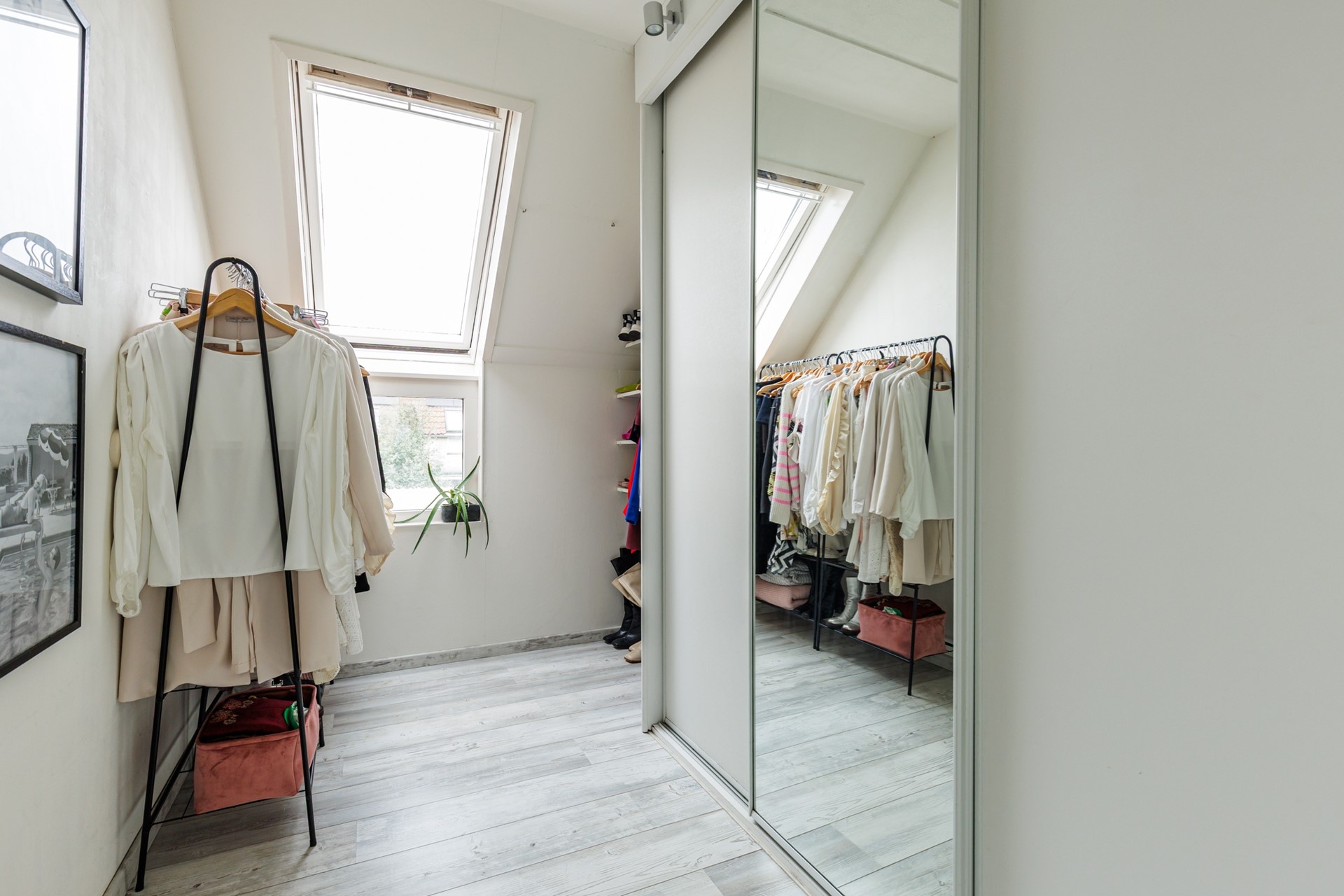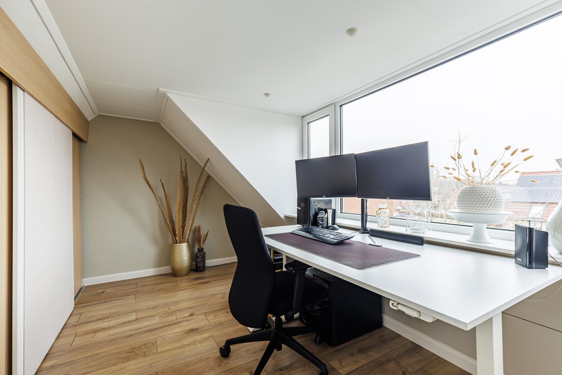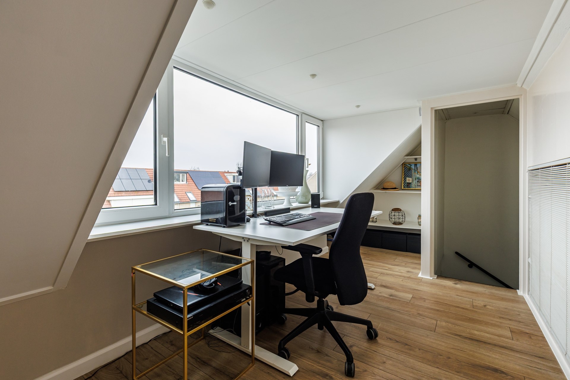 Ook de tweede verdieping is uitgebreid met een dakkapel. Hier bevindt zich de opstelling van de cv-installatie en de wasmachine- en drogeraansluiting. Daarnaast is hier de vierde slaapkamer gerealiseerd: een ideale ruimte als werkkamer, logeerkamer of extra slaapkamer voor een groter gezin. Dankzij de aanwezige glasvezelaansluiting via Odido en de lopende aanvraag voor KPN via Glaspoort is deze verdieping ook perfect geschikt als volwaardige thuiswerkplek.