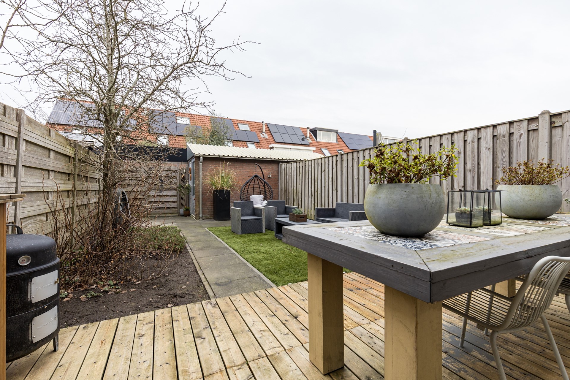 De achtertuin is gelegen op het noorden en biedt volop mogelijkheden om een fijne buitenplek te creëren. Achter op het perceel staat een stenen berging, ideaal voor fietsen, tuinspullen of extra opslag.