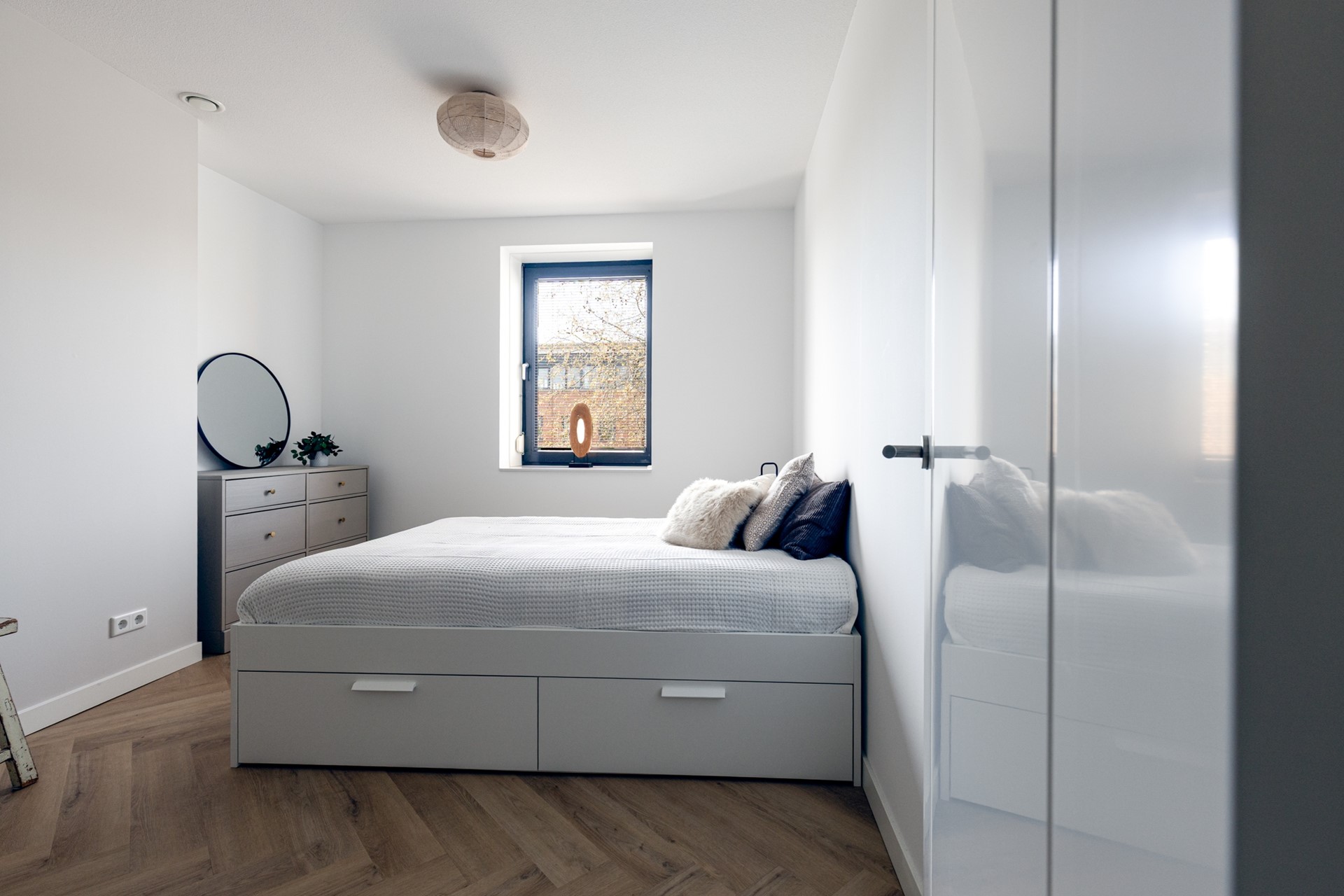 De slaapkamer is ruim en praktisch in te delen, met voldoende plek voor een grote kast. De badkamer is modern en compleet, voorzien van een inloopdouche, wastafel en een stijlvol meubel.