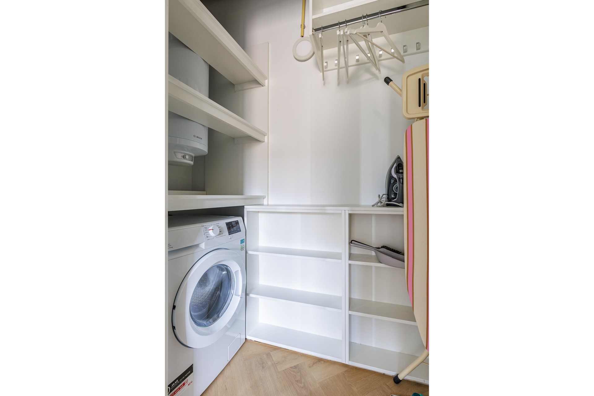 Je komt binnen via de nette centrale entree met lift en trappenhuis. In het appartement zelf kom je in de hal met meterkast, modern toilet en een praktische wasruimte met aansluitingen voor wasmachine en droger, plus extra bergruimte.