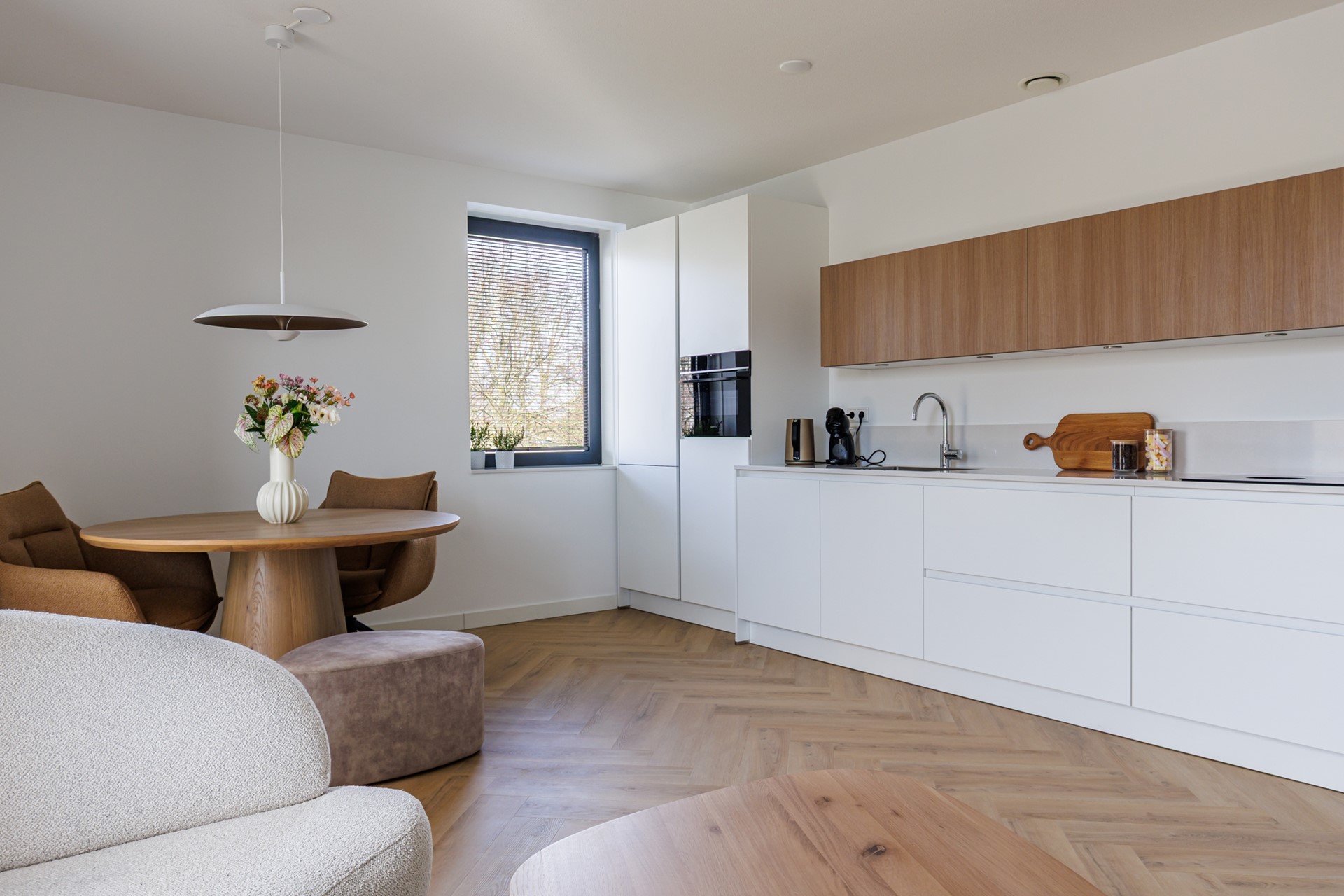 De open keuken is modern uitgevoerd en voorzien van diverse inbouwapparatuur, waaronder een kookplaat, afzuigkap, oven, vaatwasser en koel-/vriescombinatie. Alles is netjes geïntegreerd en direct klaar voor gebruik.