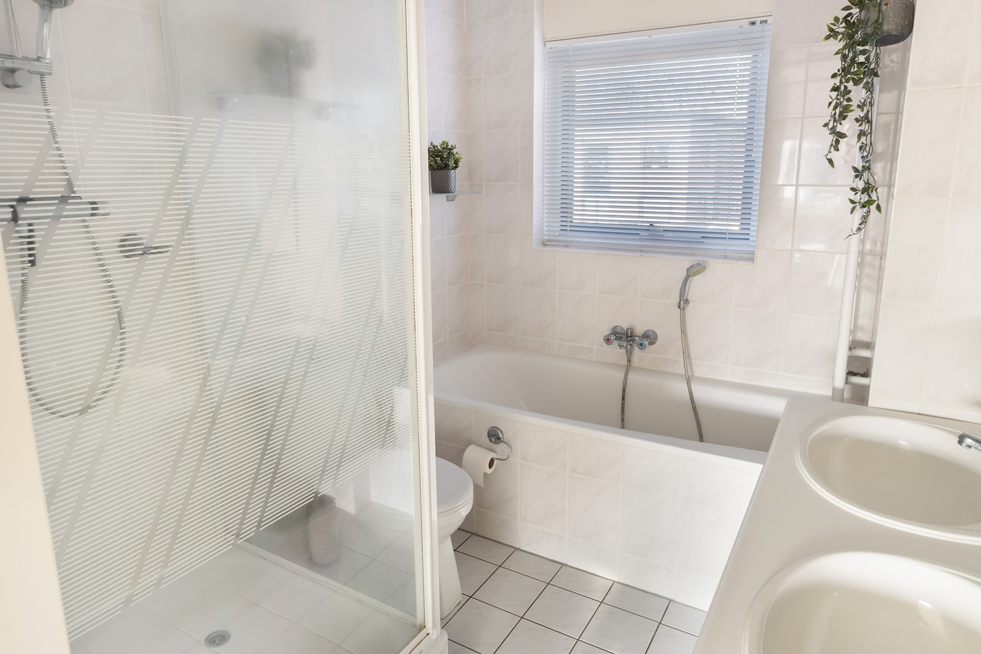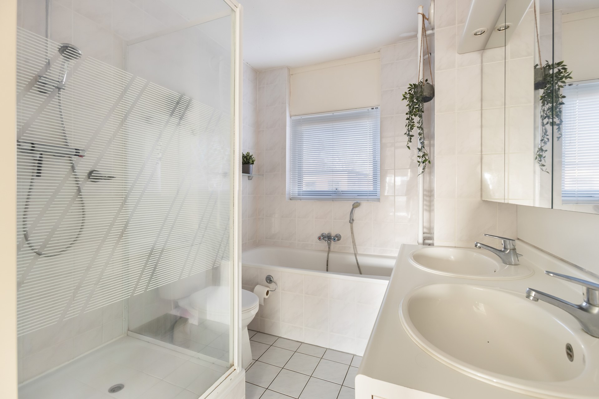 De eerste verdieping beschikt over drie fijne slaapkamers met veel lichtinval. De badkamer is wat op leeftijd, maar nog volledig functioneel, met een ligbad, aparte douche, dubbele wastafel en tweede toilet. Een praktische ruimte die je desgewenst eenvoudig naar je eigen smaak kunt moderniseren.