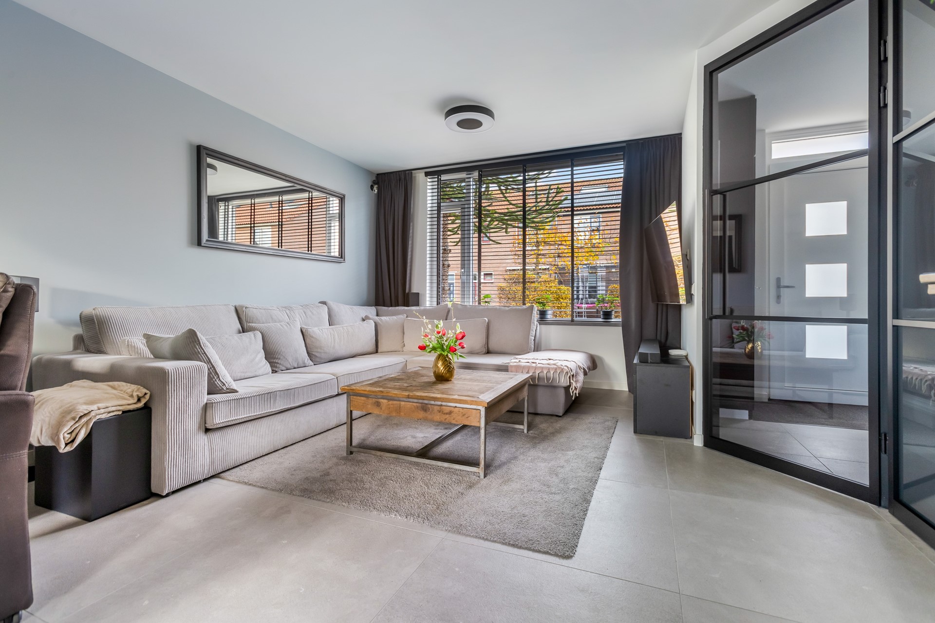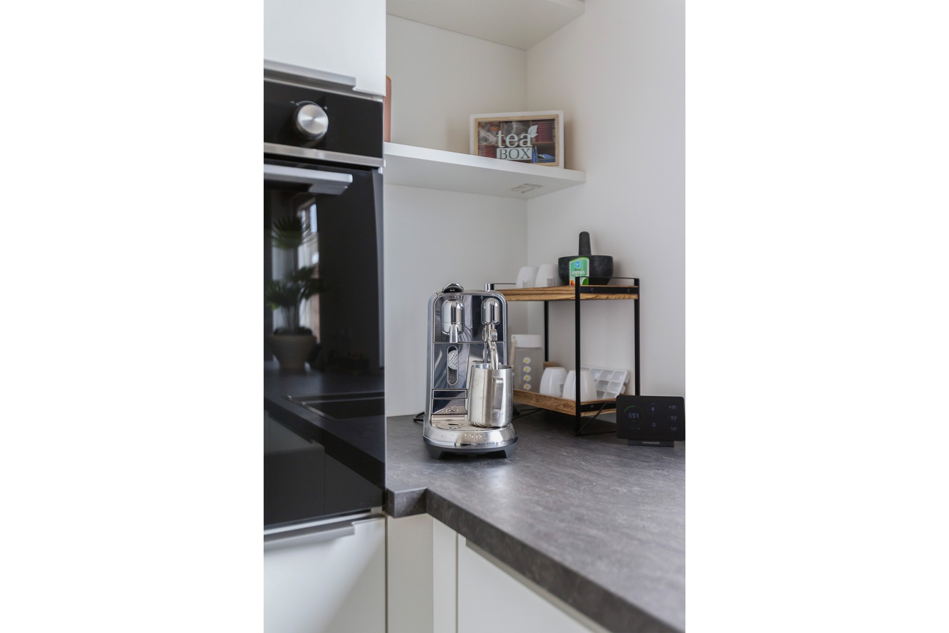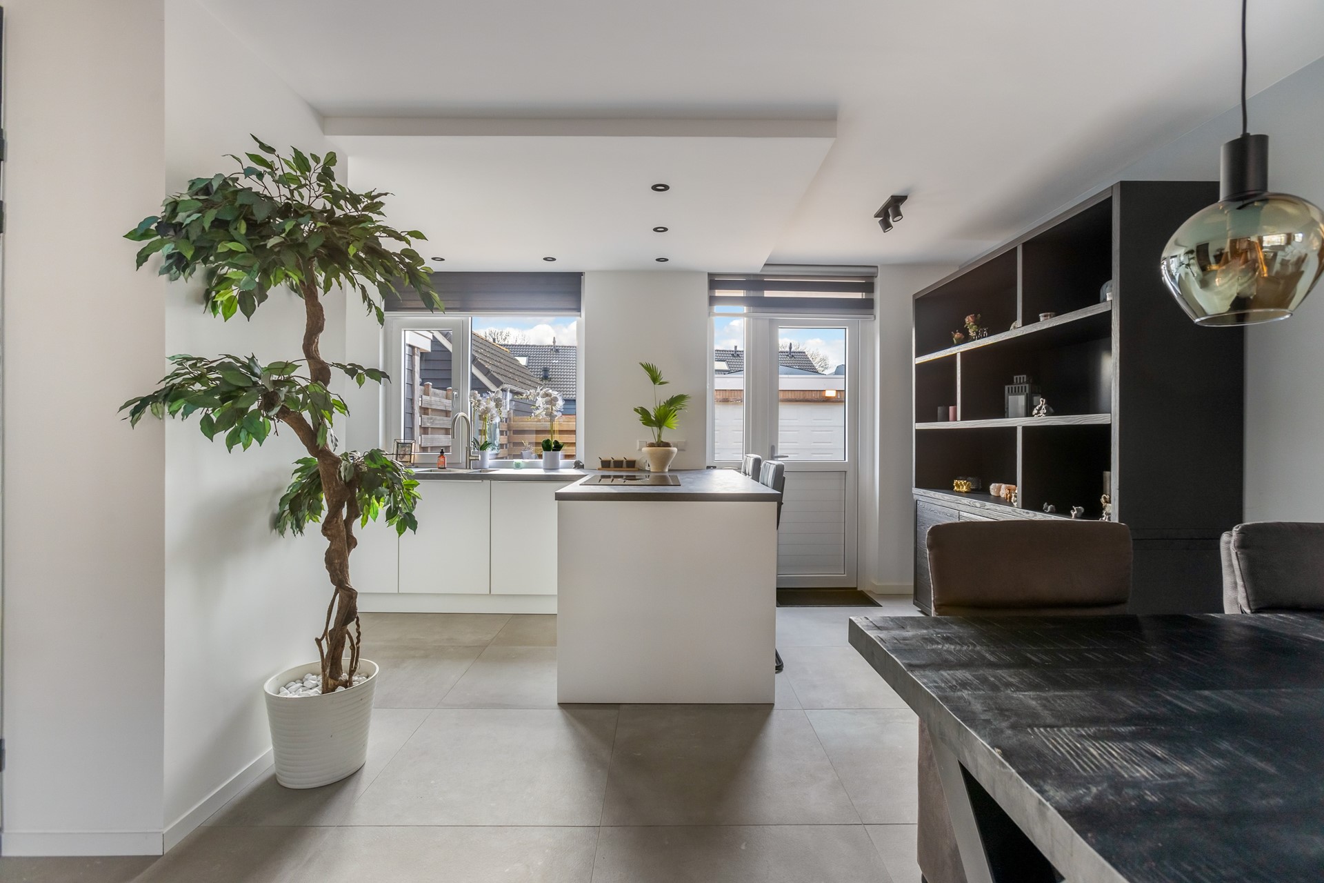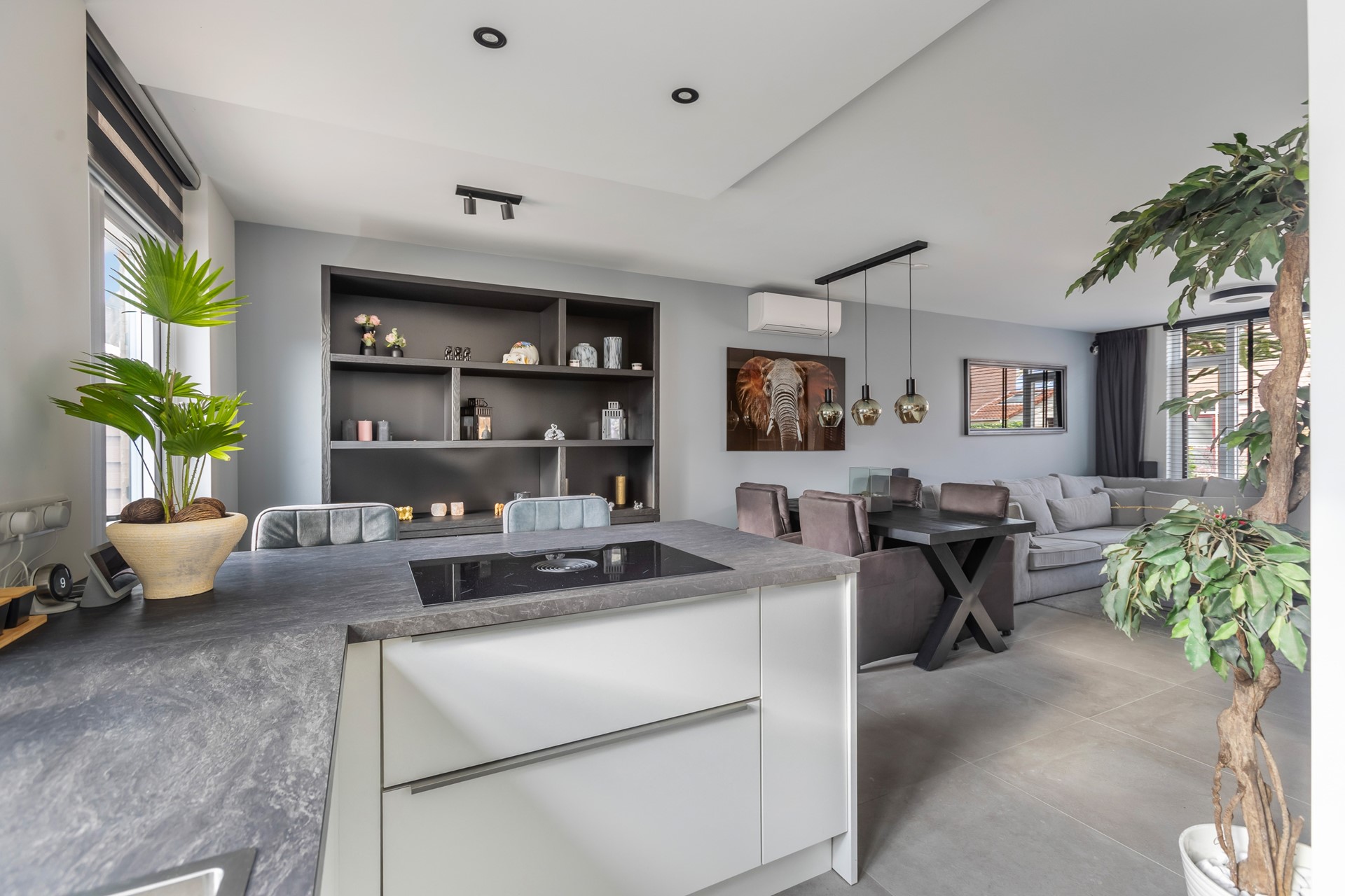 Via de hal met toilet en trapopgang kom je in de lichte woonkamer met tegelvloer en vloerverwarming. De ruimte heeft een prettige indeling met grote ramen en een open verbinding naar de keuken. Deze moderne keuken aan de voorzijde is uitgerust met hoogwaardige inbouwapparatuur: een inductiekookplaat met geïntegreerde afzuiging, combi-oven, Quooker, dubbele spoelbak, vaatwasser, koelkast en vriezer. Een heerlijke plek om te koken en gezellig samen te eten.