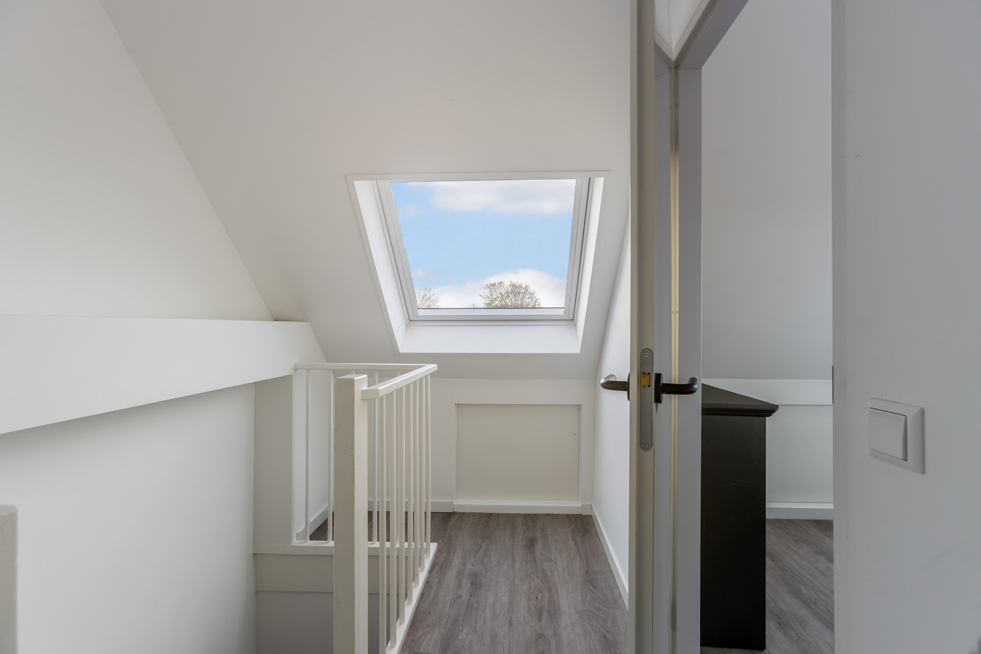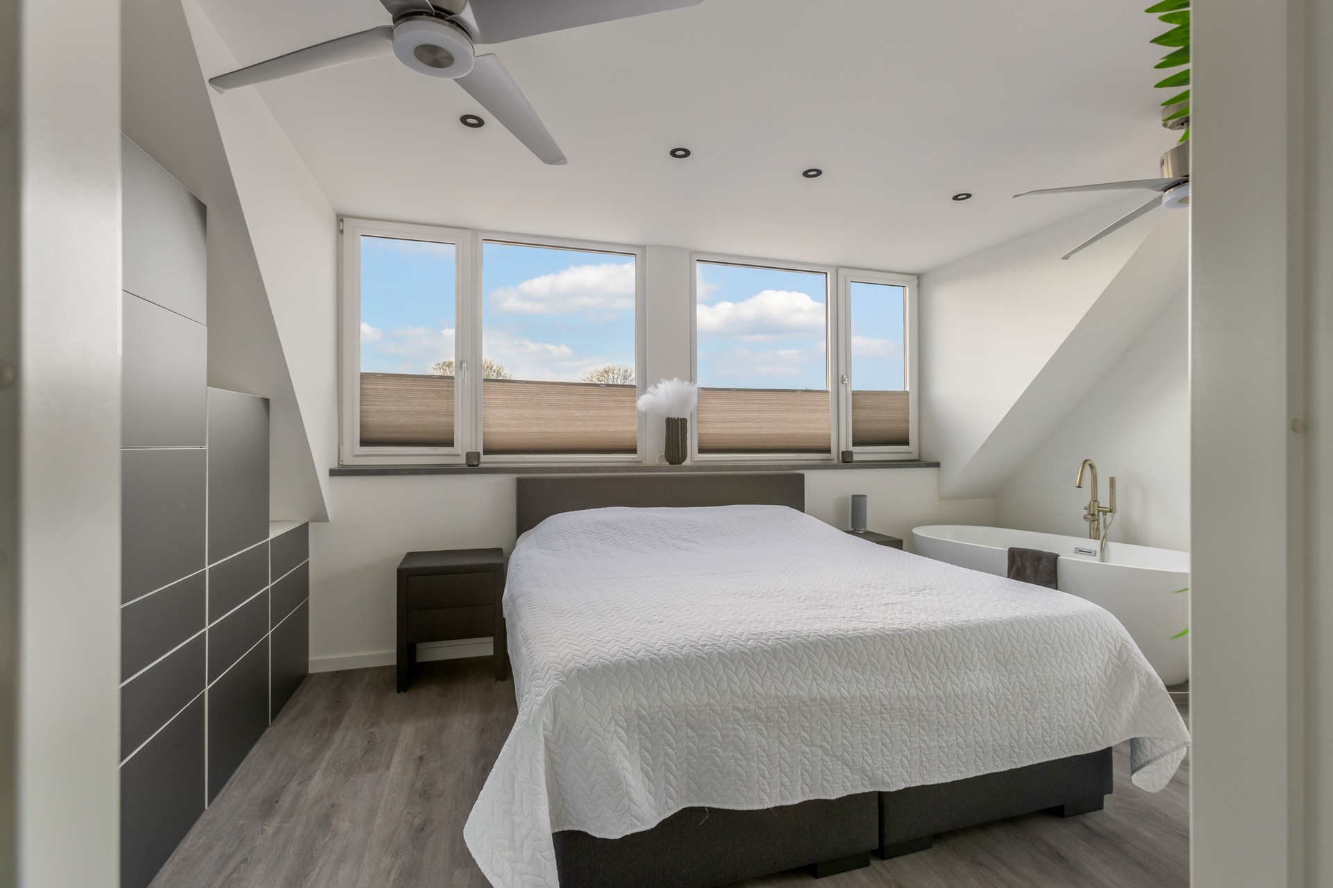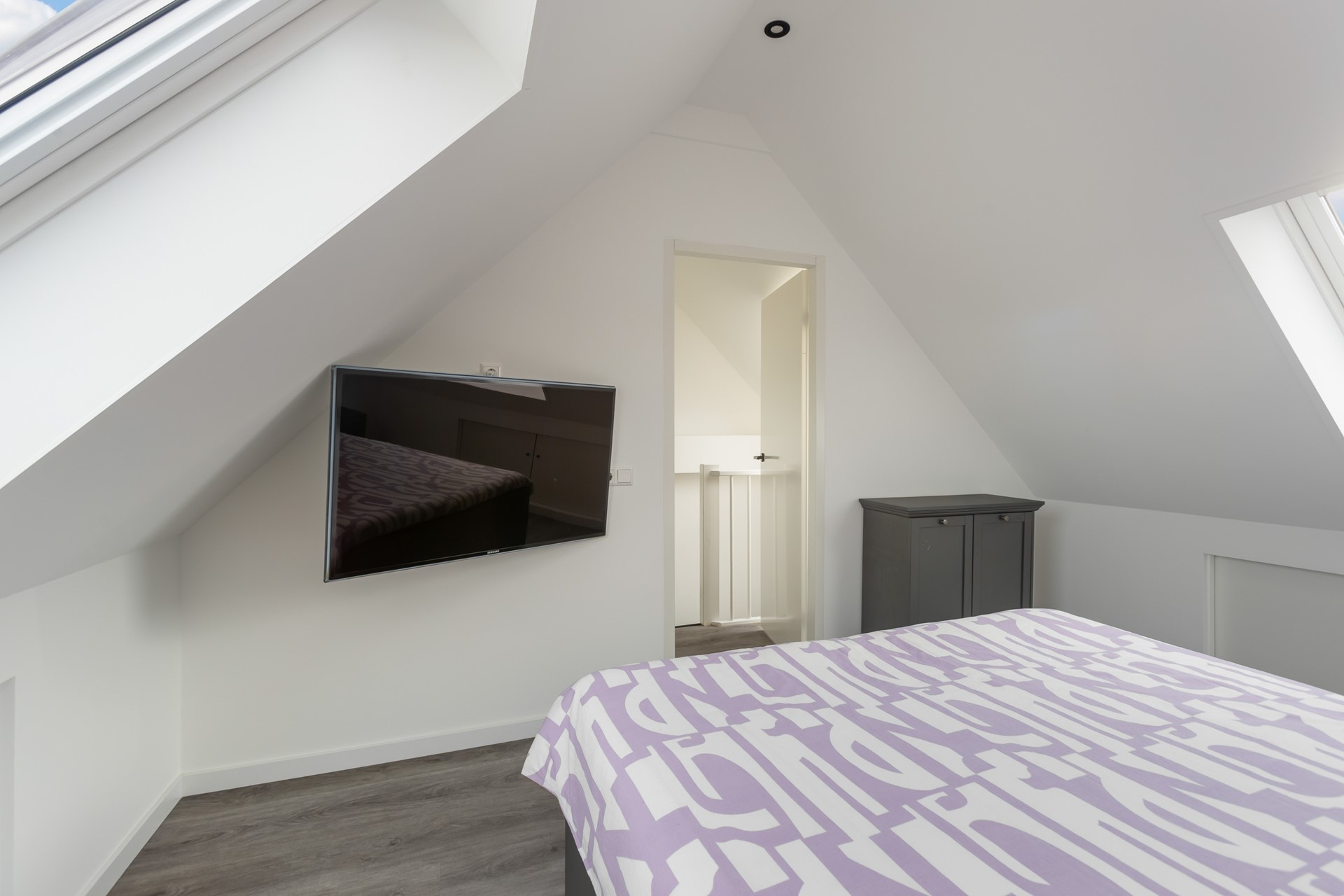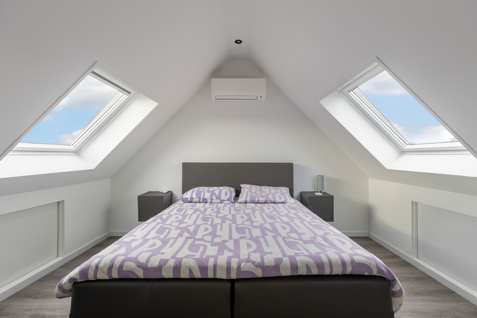 De zolderverdieping is verrassend ruim dankzij de brede dakkapel. Hier bevindt zich de derde slaapkamer, afgewerkt met een PVC-vloer en voorzien van airconditioning. Daarnaast is op deze verdieping de aansluiting voor de wasmachine aanwezig – praktisch en netjes weggewerkt.