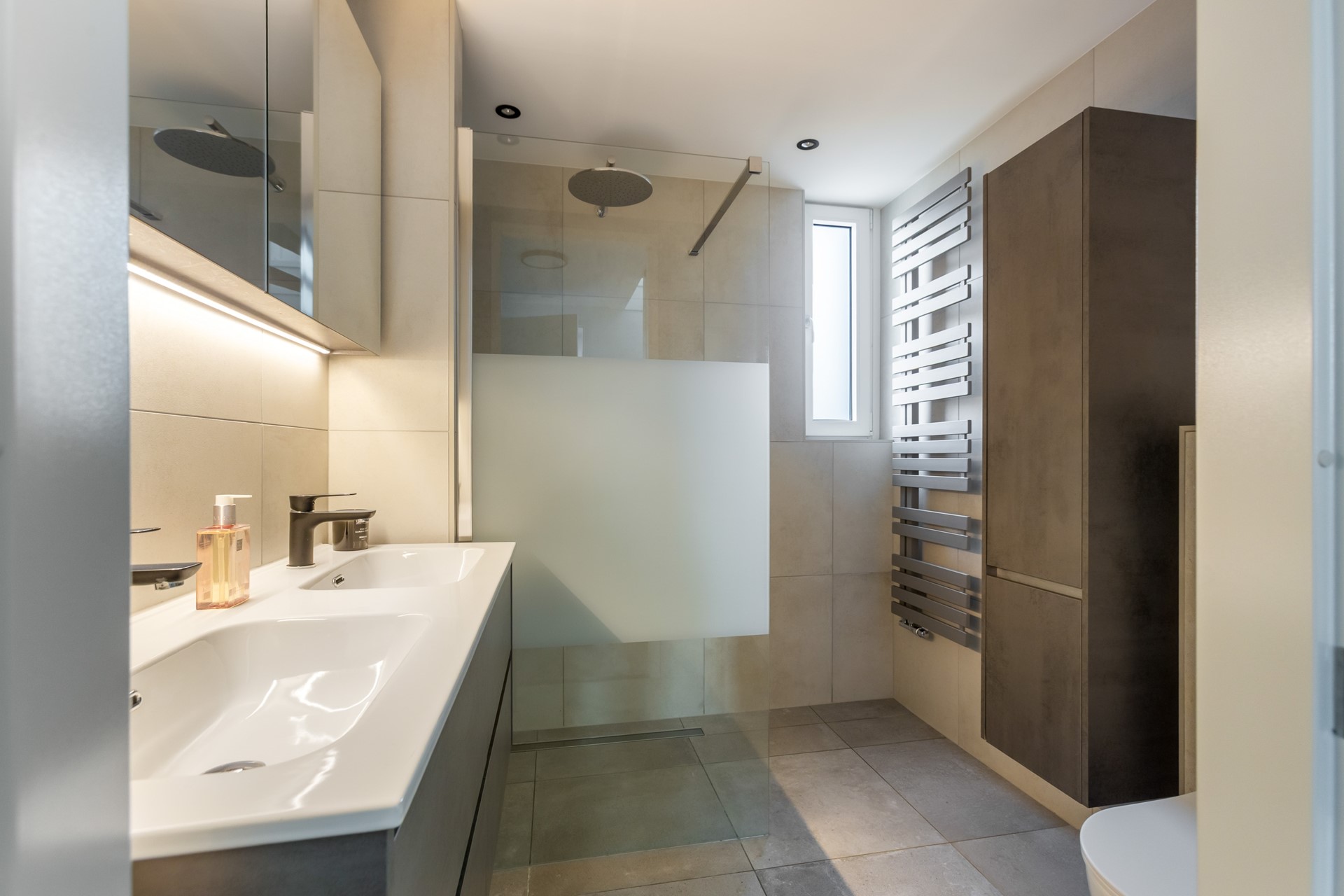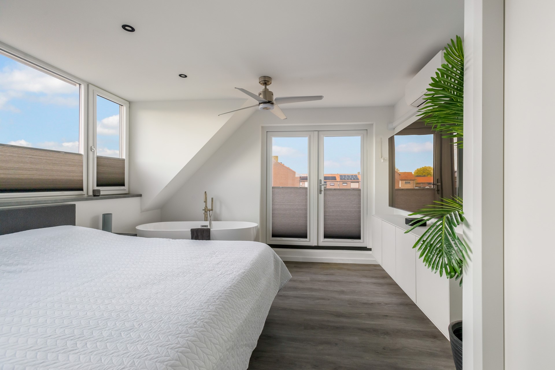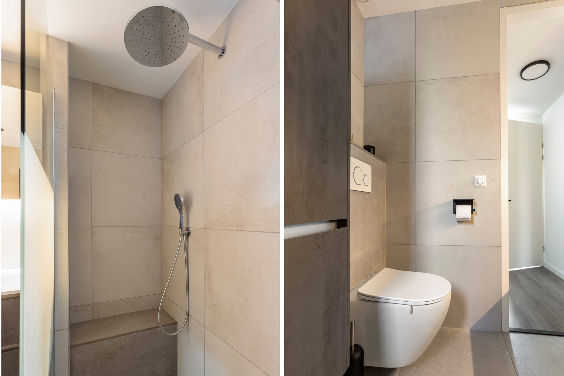 De eerste verdieping telt twee ruime slaapkamers, beide voorzien van een PVC-vloer en airconditioning. De hoofdslaapkamer aan de achterzijde beschikt bovendien over een stijlvol bad en biedt toegang tot een riant balkon/terras van circa 17 m², gesitueerd boven de aangebouwde garage – een heerlijke plek om in alle privacy van de zon te genieten. De moderne badkamer is smaakvol afgewerkt en voorzien van een inloopdouche, dubbele wastafel met verwarmde en verlichte spiegel en een tweede toilet.