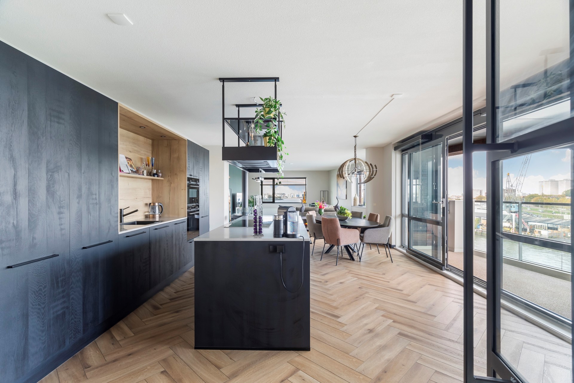 De ruime woonkamer is een ware blikvanger dankzij de grote raampartijen en het indrukwekkende uitzicht over de stad en de haven. De gelhaard maakt de woonkamer extra sfeervol en zorgt voor een gezellige plek om samen te komen. De nieuwe open keuken, uitgevoerd in warme tinten, is het hart van de woning. De keuken is uitgerust met een kookeiland, voorzien van een composiet werkblad en diverse hoogwaardige inbouwapparatuur. Het mooiste van alles? Terwijl je hier staat te koken, geniet je van een prachtig uitzicht over het water en de haven. De keuken is niet alleen praktisch, maar ook een plek waar je volop kunt genieten van het buitenleven terwijl je je culinaire creaties bereidt.