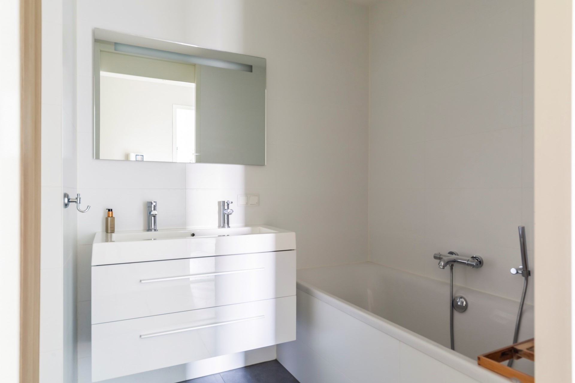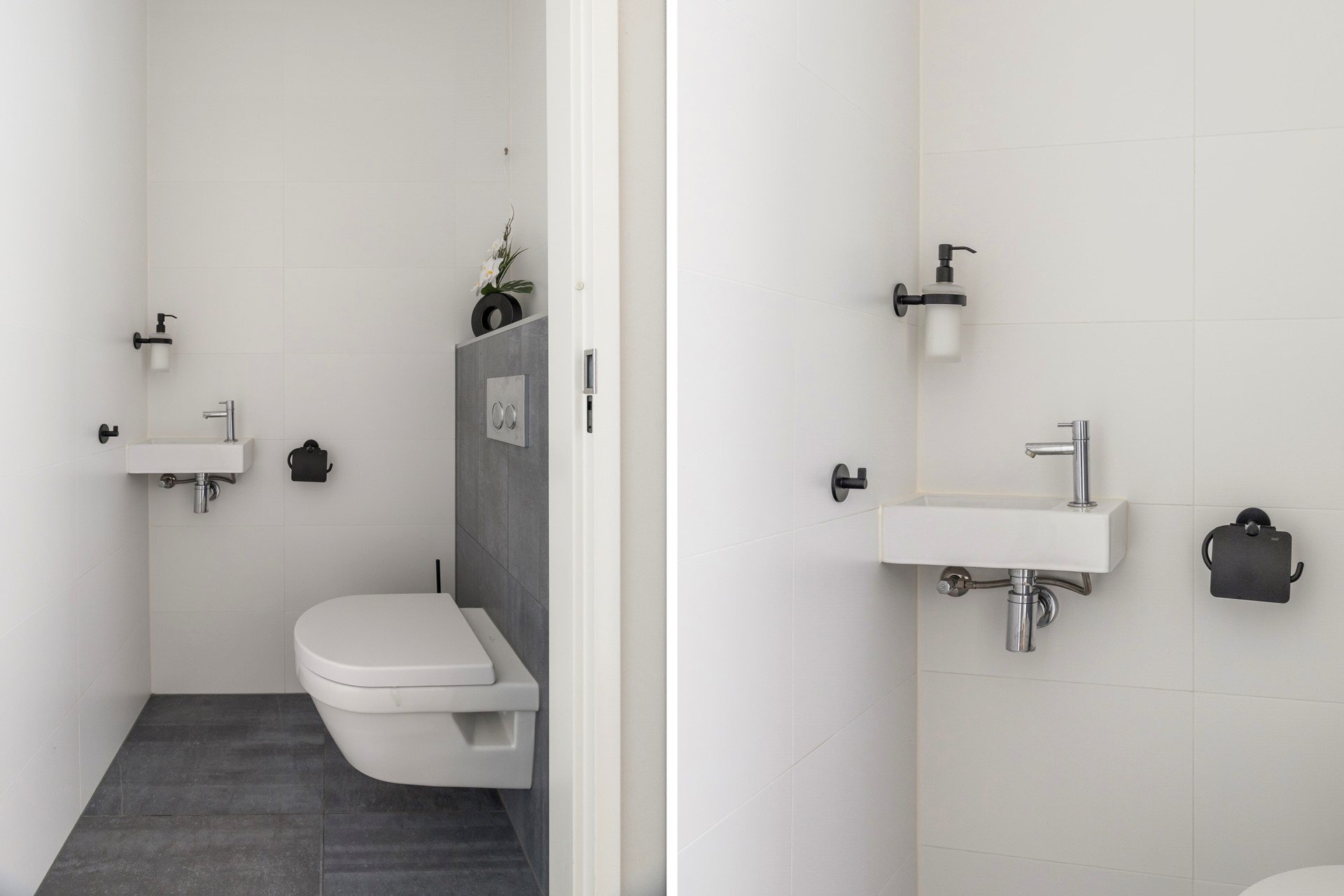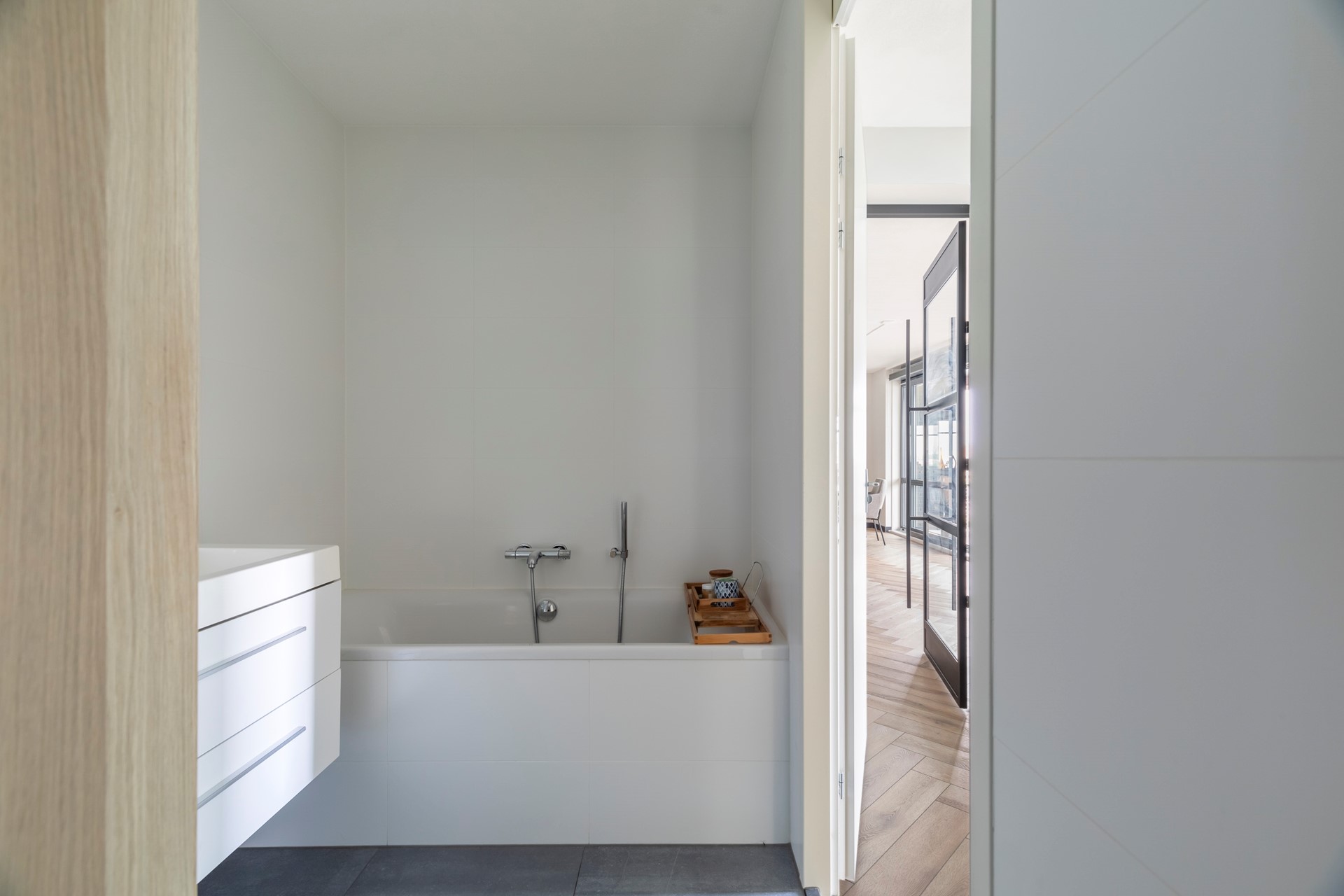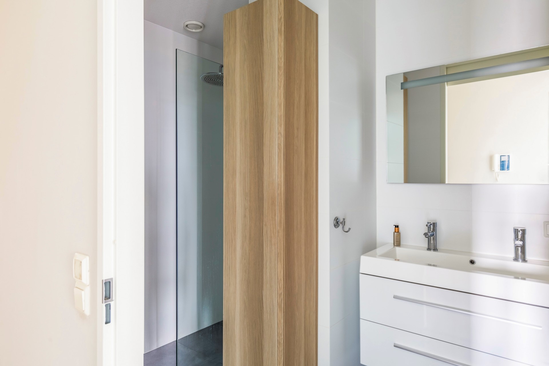 De badkamer is modern uitgevoerd en voorzien van een ruime inloopdouche, een wastafelmeubel en een designradiator. Daarnaast is er een separaat toilet en een praktische interne berging met aansluitingen voor wasmachine en droger.